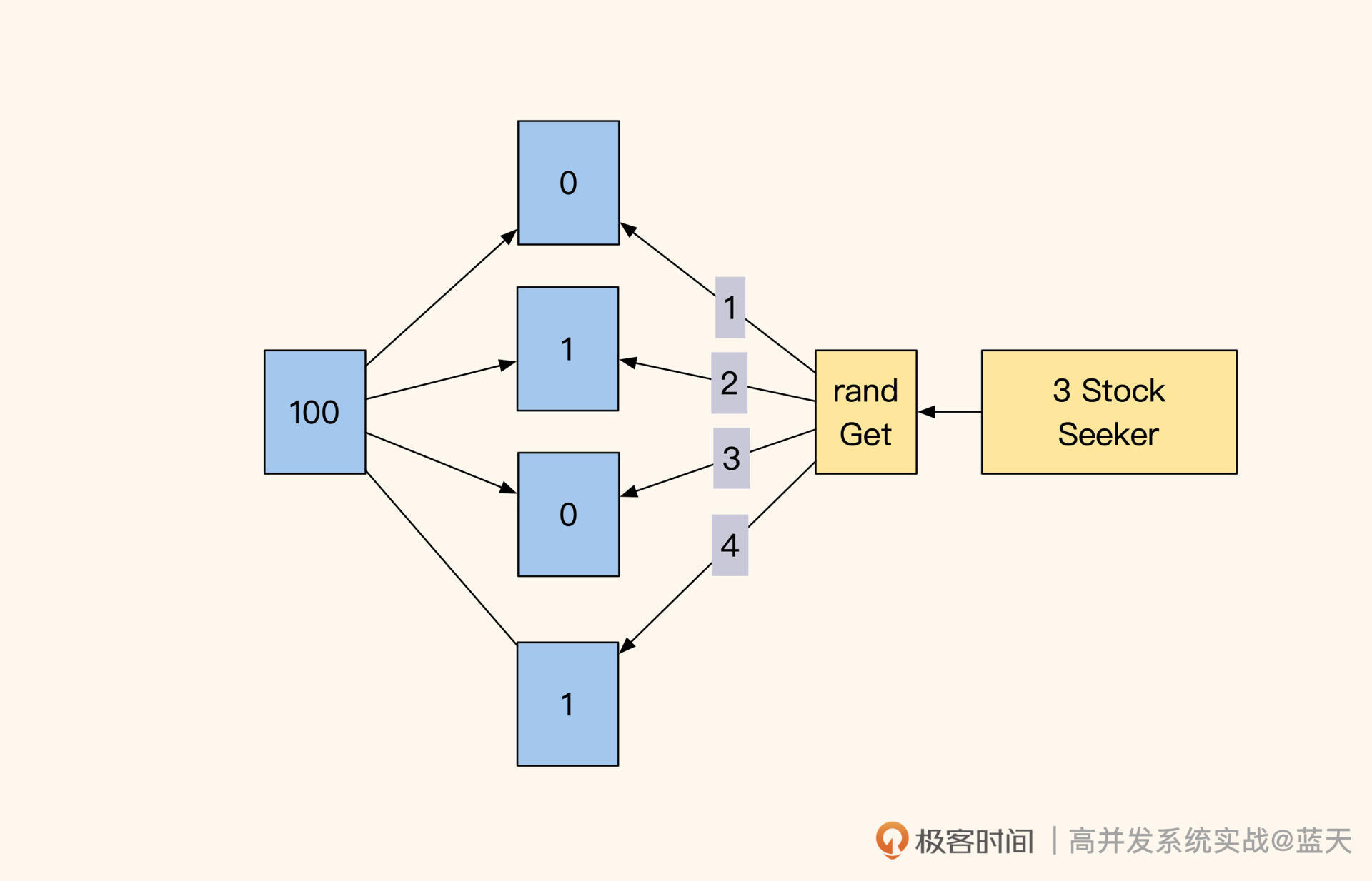 到这里,关于库存的设计看起来已经很完美了,不过请你想一想,如果产品侧提出“一个商品可以抢多个库存”这样的要求,也就是一次秒杀多个同种商品(比如一次秒杀两袋大米),我们利用多个锁降低锁争抢的方案还能满足吗?