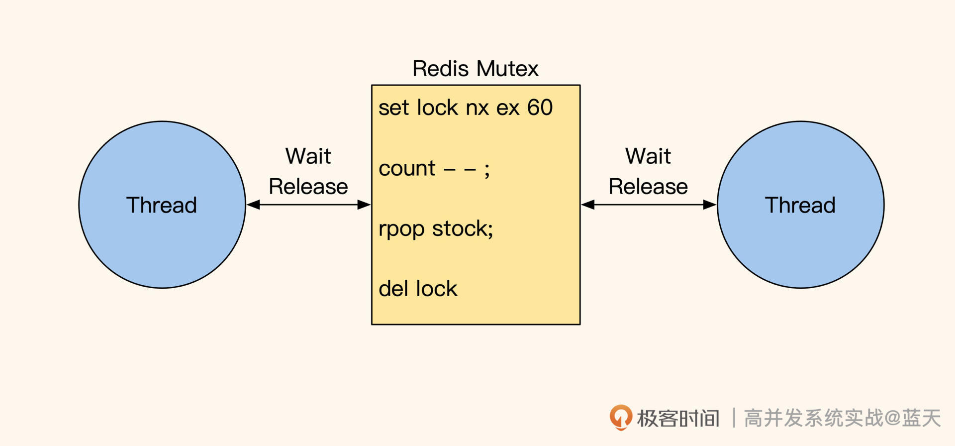 除此之外我再推荐一个实现方式:CAS乐观锁。**相对于自旋互斥锁来说,它在并发争抢库存线程少的时候效率会更好。**通常,我们用锁的实现方式是先抢锁,然后,再对数据进行操作。这个方式需要先抢到锁才能继续,而抢锁是有性能损耗的,即使没有其他线程抢锁,这个消耗仍旧存在。