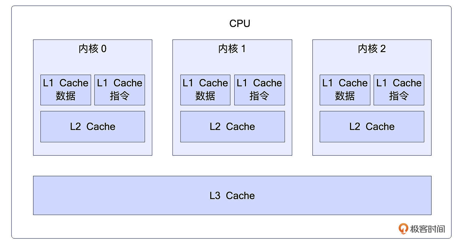 CPU 在读取数据时,会先在 L1 缓存中寻找,如果未命中,再从 L2 缓存寻找,然后是 L3 缓存,再其次是内存,最后是磁盘。如果在缓存中找到数据就意味着缓存命中,如果没找到就称为缓存缺失。