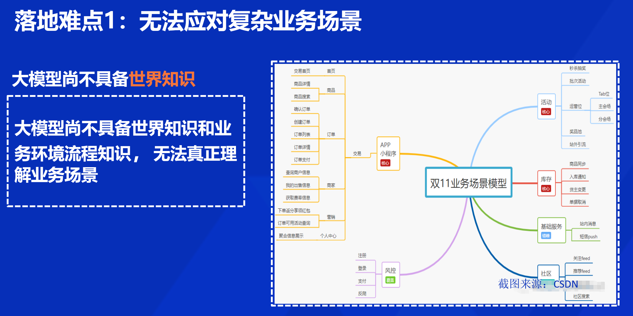 第一个难点在于,虽然LLM在通用知识和语言理解方面表现出色,但在处理特定的复杂业务场景时往往力不从心。主要原因是缺乏特定领域知识:LLM 通常是基于通用数据训练的,缺乏对特定行业或业务流程的深入理解。而且,每个企业都有其独特的业务流程和规则,LLM 无法自动掌握这些细节,也无法准确把握业务需求的微妙之处,导致生成的内容或建议可能偏离实际需求。