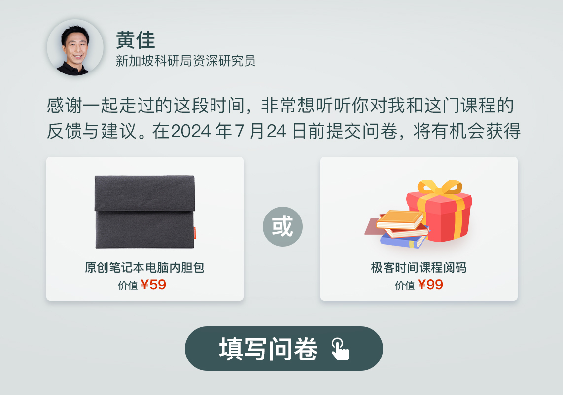 最后,这里有一份调研问卷,期待你能谈谈对这门课程的学习体验,建议或意见都欢迎指出。我们会根据你的反馈持续迭代课程,让知识长久传递,内容常看常新!