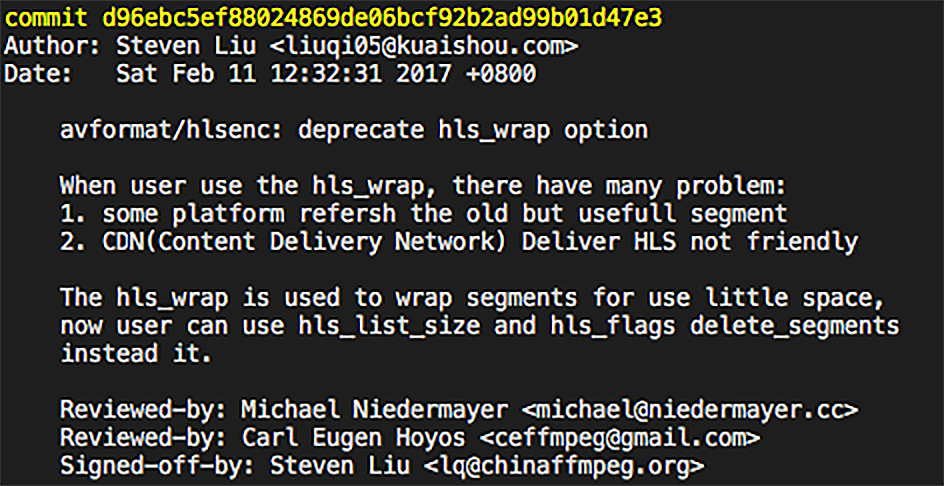 当时我在蓝汛从事CDN流媒体服务开发与支持,遇到了一个客户因为使用FFmpeg切片时hls_wrap参数设置得不太合理,导致客户端出现播放卡顿。但客户认为FFmpeg支持就是合理的。这时候我的职业操守告诉我一定要解决这个问题,所以我就开始参与到FFmpeg社区的交流中,通过不断地给FFmpeg解决bug、添加功能、提交patch,最后我成为了FFmpeg的项目维护者,之后我就按照规则删掉了这个hls_wrap。