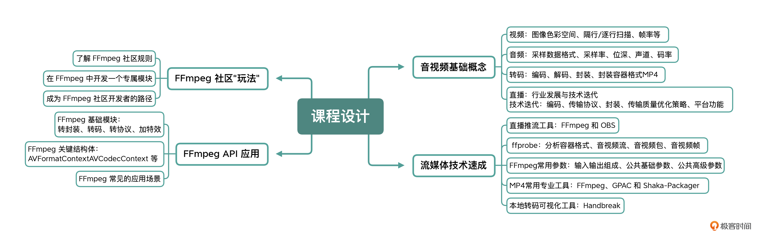 做好这三点,你就能快速地入门音视频技术了。为了帮助你更好地去实施,我会这样来安排这门课程。