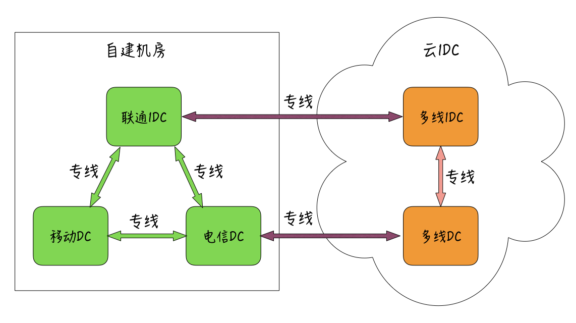 对于拥有多机房的公司,也可以只把上传存储服务部署在单线机房,然后再通过专线解决多个单线机房之间的访问。比如,目前微博消息箱图片的上传,就是采用这种网络访问架构。大概IDC网络架构如下图: