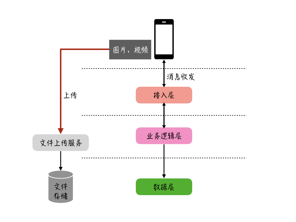 在上传普通文本消息时,为了保证发送通道的稳定性,一般会把接入服务和业务逻辑处理服务进行拆分部署,再加上最前端还有负载均衡层,这样,实际的上传链路至少已经有3层。另外,多媒体消息在上传时,在业务逻辑层后面一般还有一个用于文件存储的服务。因此,如果多媒体消息也通过文本消息的通道上传,整体链路会比较长。