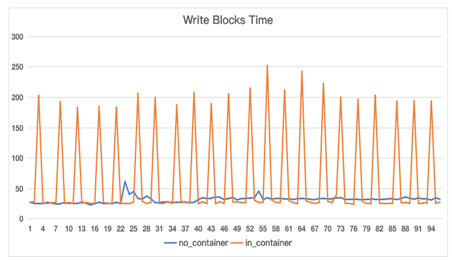 运行结束后,我们比较一下程序写数据块的时间。我把结果画了一张图,图里的纵轴是时间,单位us;横轴是次数,在这里我们记录了96次。图中橘红色的线是在容器里运行的结果,蓝色的线是在虚拟机上运行的结果。