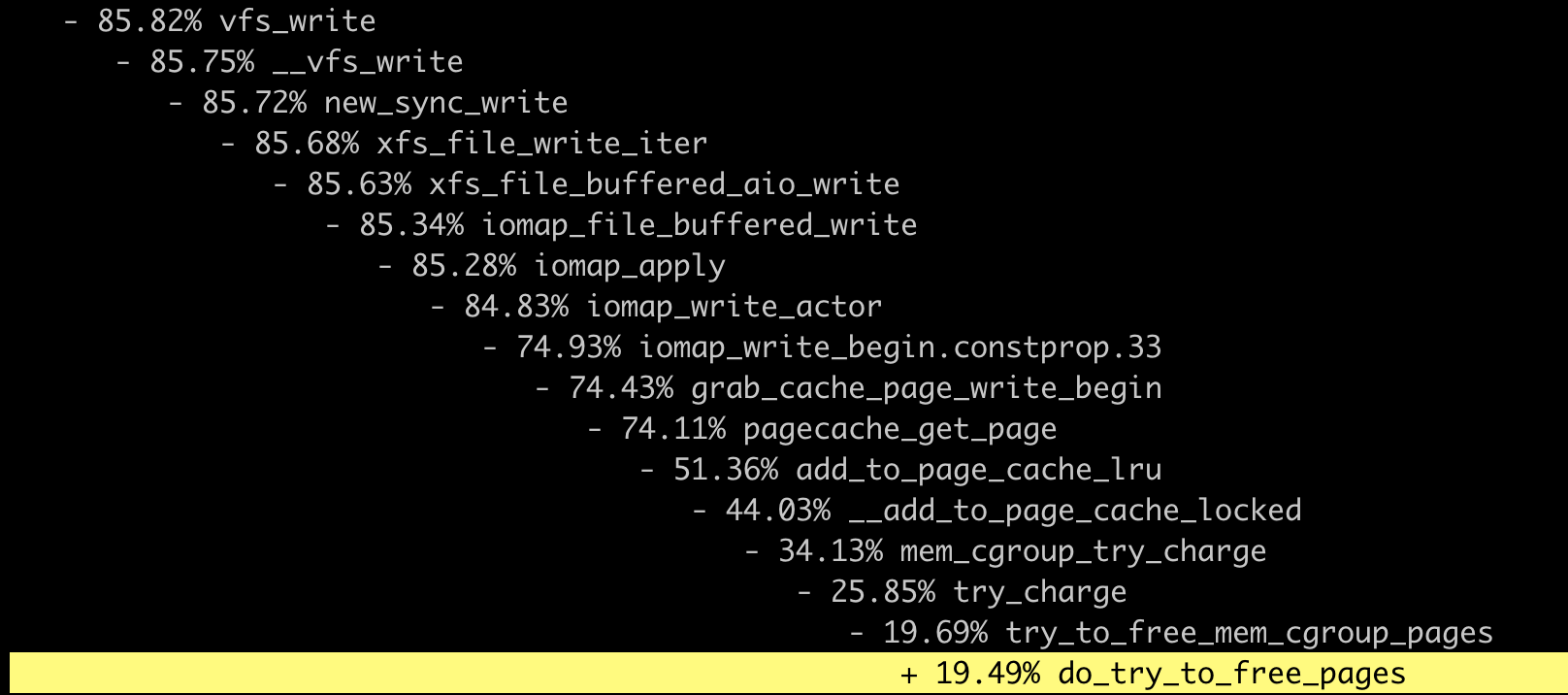 这时我们可以看到,当需要申请Page Cache页面的时候,write()系统调用会反复地调用mem_cgroup_try_charge(),并且在释放页面的时候,函数do_try_to_free_pages()花费的时间特别长,有50+us(时间单位,micro-seconds)这么多。