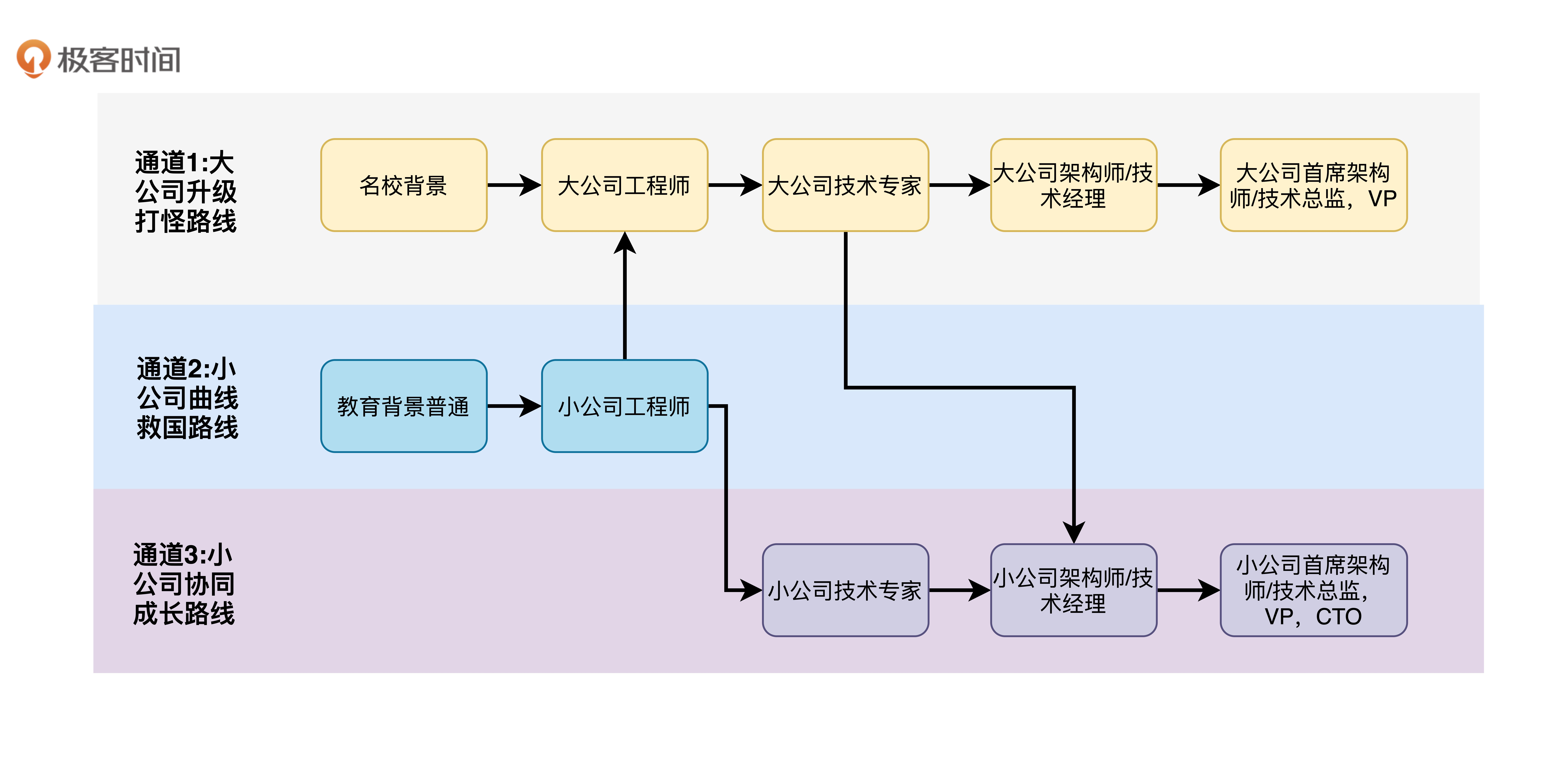 中间的通道2,我称为**“小公司曲线救国”路线**。这条路线适合刚开始由于教育背景等问题,没办法加入大公司的同学。如果你有一个大公司梦,那么不妨先加入相关行业的小公司积攒经验,再寻求合适的时机跳槽到大公司。需要注意的是,如果你选择这条道路,那么就不要在小公司花费过多的时间去升职,因为小公司的职级一般不被大公司完全认可。你更应该做的,是提升自己的能力,把小公司当作一个积攒领域经验的机会就好。