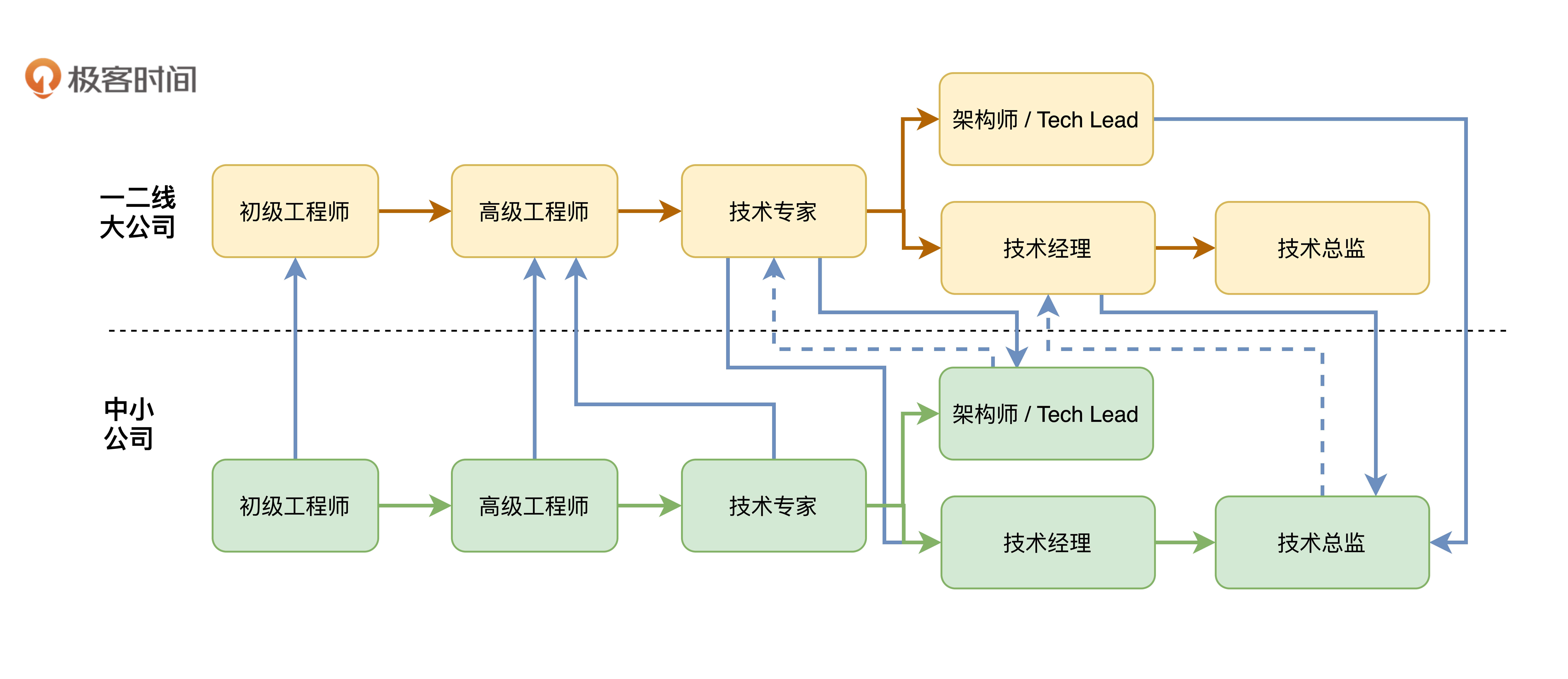 图2描绘了程序员在大公司和中小公司的典型发展路径。 总体来看,无论是在大公司还是中小公司,一名初级工程师都要经历长时间的打怪升级,才能到达较高的职位。坚持在技术线发展的同学会成为架构师或者Tech Lead,有管理能力的同学会成为技术经理。