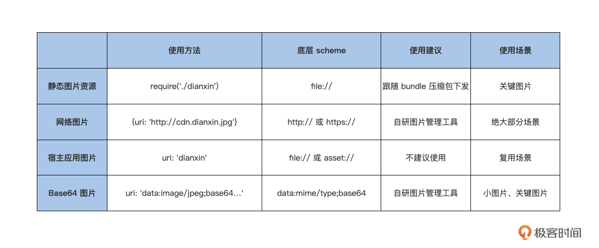 **但在实际工作中,我不推荐你在 React Native 中使用宿主应用图片资源。**首先,这种加载图片的方法没有任何的安全检查,一不小心就容易引起线上报错。第二,大多数 React Native 是动态更新的,最新代码是跨多个版本运行的,而 Native 应用是发版更新的,应用的最新代码只在最新版本运行,这就导致 React Native 需要确切知道 Native 图片到底内置在哪些版本中,才能安全地使用,这对图片管理要求太高了,实现起来太麻烦了。