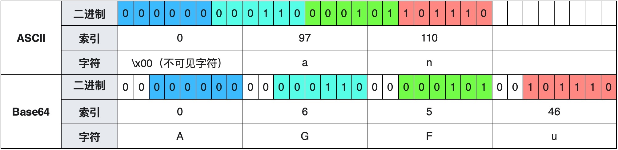 需要注意的是,ASCII 256 个字符需要 8 个比特来表示(2^8=256),Base64 的 64 个字符只需要 6 个比特位来表示(2^6=64)。但实际上,Base64 字符也是以 ASCII 码的形式存在,因此这里就有 2 个比特的浪费(8-6=2)。
