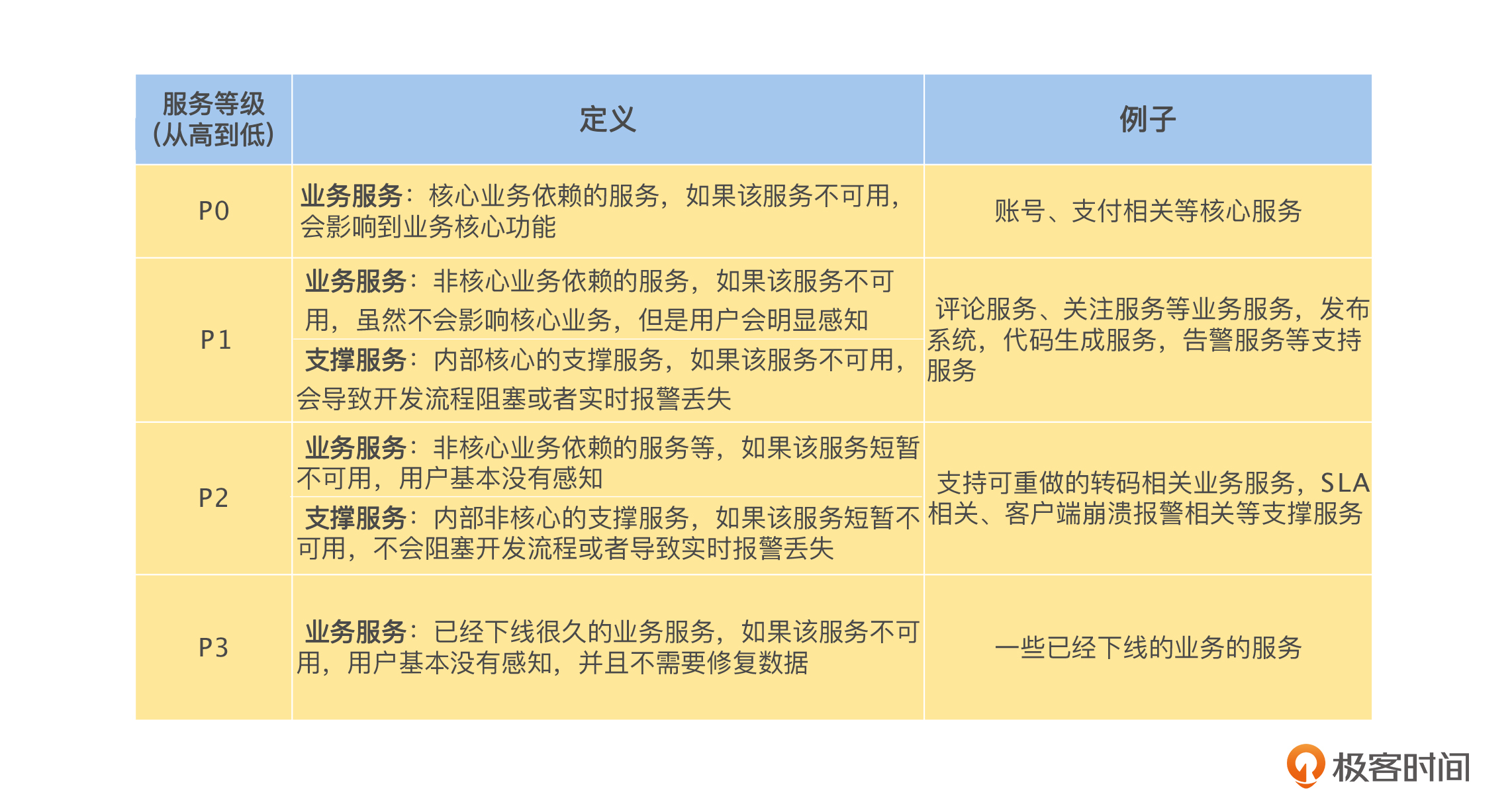 首先,将系统中的所有服务,按照对业务的重要程度进行分级,这里,我分享一个服务定级的标准,具体定义见下表。这个标准从高到低按重要程度分为 P0 ~ P3 这 4 个级别,你可以作为参考,依据自己的业务形态进行调整。