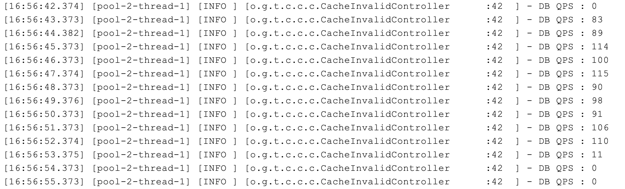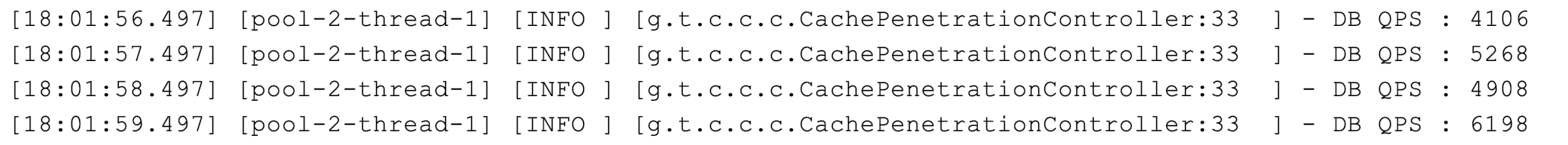 我们来重现下这个问题。在程序启动的时候,初始化一个热点数据到Redis中,过期时间设置为5秒,每隔1秒输出一下回源的QPS: