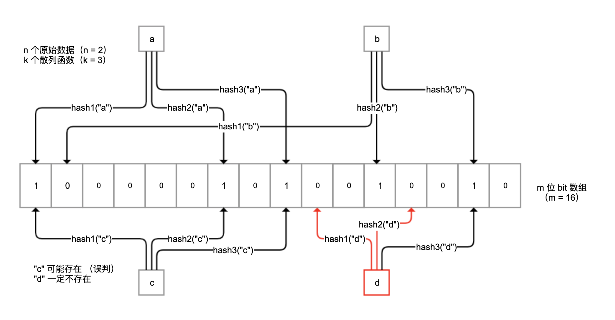 布隆过滤器不保存原始值,空间效率很高,平均每一个元素占用2.4字节就可以达到万分之一的误判率。这里的误判率是指,过滤器判断值存在而实际并不存在的概率。我们可以设置布隆过滤器使用更大的存储空间,来得到更小的误判率。