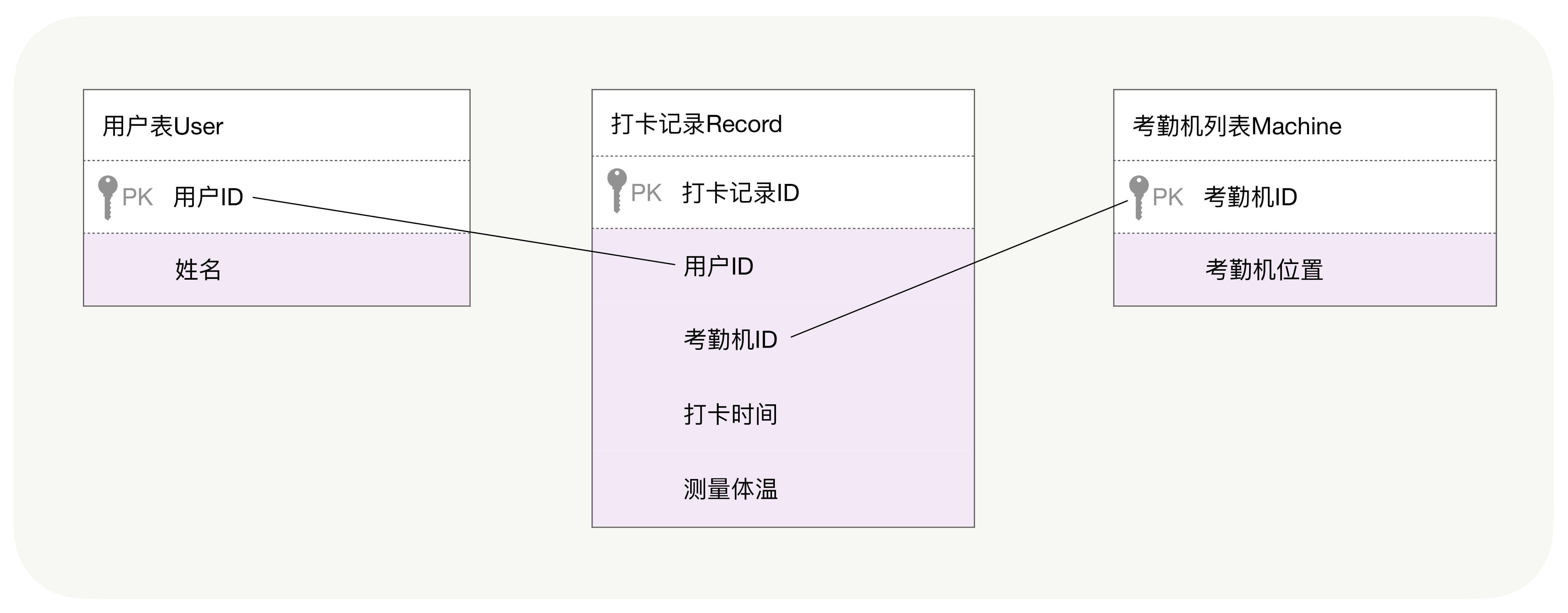 关系数据库对业务层开发效率的提升有很大帮助。下面我们先基于一个简单的例子,看看关系数据库有何优点。疫情期间新增了一批能够测量体温的考勤机,通过关系数据库我们新建了用户、考勤机、考勤记录三张表,如下图所示: