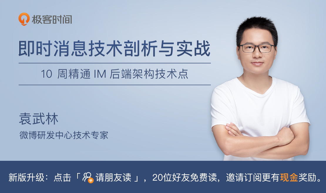 你好,我是袁武林。我来自新浪微博,目前在微博主要负责消息箱和直播互动相关的业务。接下来的一段时间,我会给你带来一个即时消息技术方面的专栏课程。