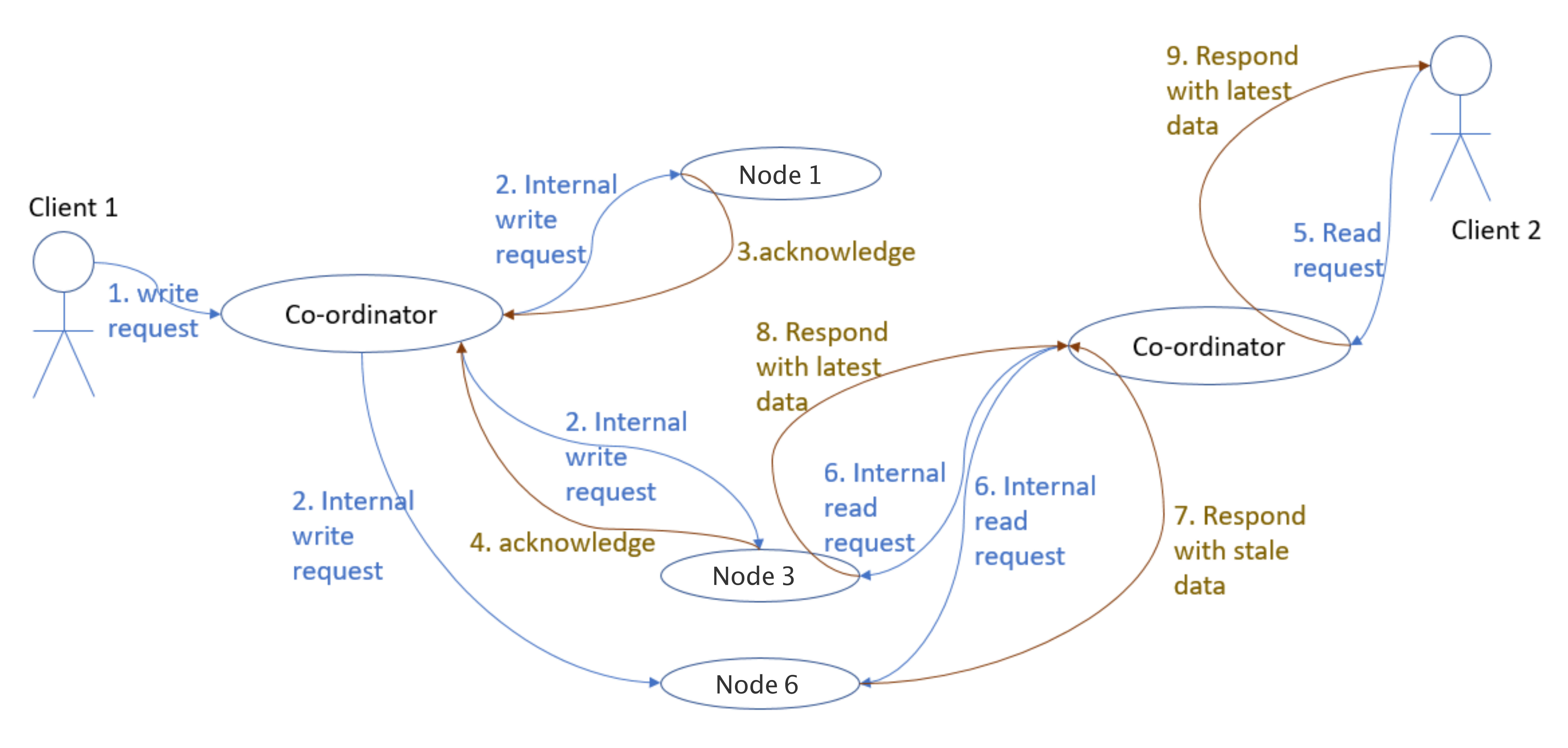 下图中,客户端1在第2步,同时向3个存储节点写入了数据,由于节点1、3返回成功,所以写入操作实际已经完成了,但是节点6由于网络故障,却一直没有收到Coordinator Node发来的写入操作。在强一致性的约束下,客户端2在第5步发起的读请求,必须能获取到第2步写入的数据。然而,客户端2连接的Coordinator Node与客户端1不同,它选择了节点3和节点6,这两个节点上的数据并不一致。根据不同的timestamp时间戳,Coordinator Node发现节点3上的数据才是最后写入的数据,因此选择其上的数据返回客户端。这也叫Last-Write-Win策略。