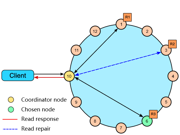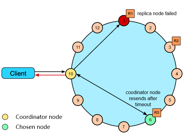 再来看读取数据的流程。下图中,作为Coordinator Node的节点10首先试图读取节点1中的数据,但发现节点1已经宕机,于是改选节点6并获取到数据,由于R = 1于是立刻向客户端返回成功。