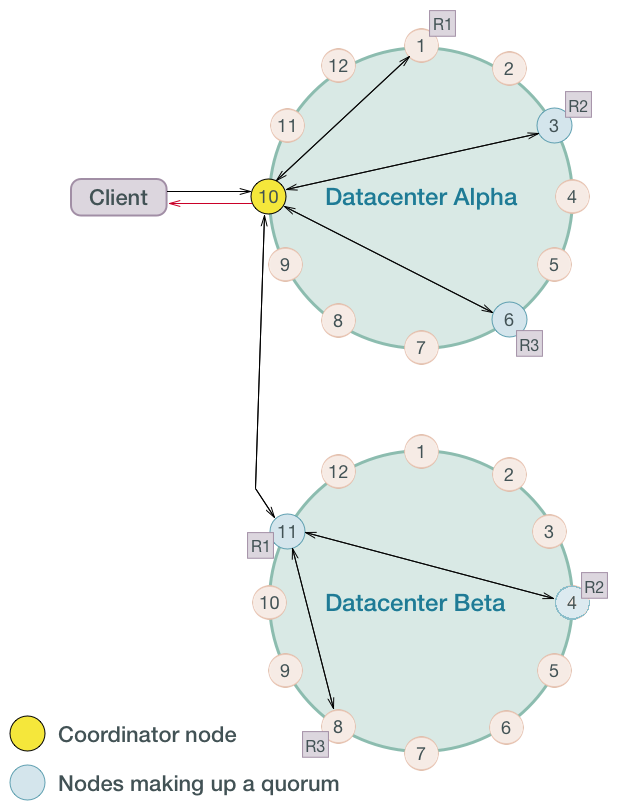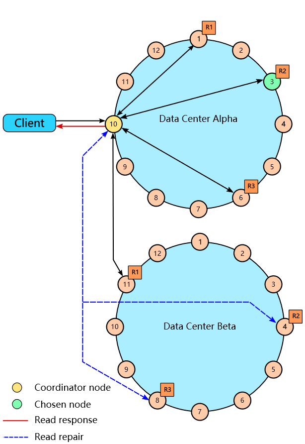 读取数据时,这2个IDC内必须由4个存储节点返回数据,才满足QUORUM一致性的要求。下图中,Coordinator Node获取到了IDC Alpha中节点1、3、6的返回,以及IDC Beta中节点11的返回,就可以基于timestamp时间戳选择最新的数据返回客户端。而且Coordinator Node会并发地发起Read repair,试图修复IDC Beta中可能存在不一致的节点4和8。
