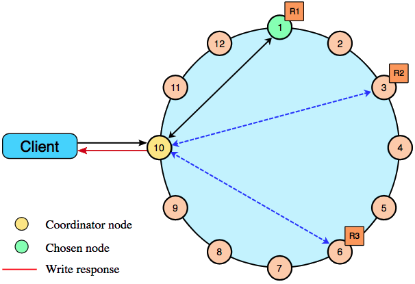 上图中的系统由12个主机节点构成,由于数据采用一致性哈希算法分片,故构成了一个节点环。其中,本次写入的数据被分布到1、3、6这3个节点中存储。客户端可以随机连接到系统中的任何一个节点访问Cassandra,此时该节点被称为Coordinator Node,由它根据NWR的值来选择一致性模型,访问存储节点。