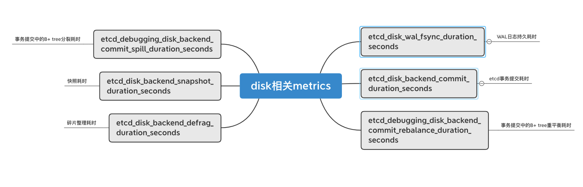 当然是影响集群可用性的最核心的metric。比如是否有Leader、Leader切换次数、WAL和事务操作延时。etcd社区提供了一个丰富的告警规则,你可以参考下。