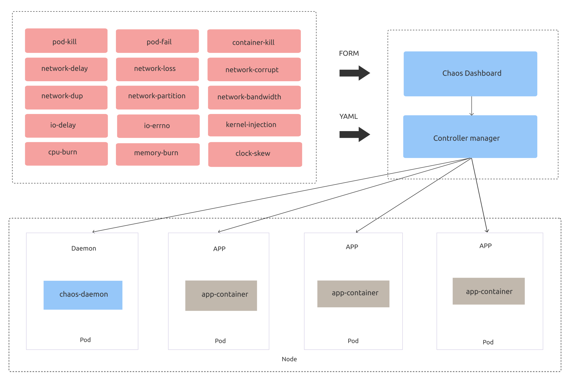 开源社区在混沌工程领域诞生了若干个优秀的混沌工程项目,如chaos-mesh、chaos-blade、litmus。这里我重点和你介绍下chaos-mesh,它是基于Kubernetes实现的云原生混沌工程平台,下图是其架构图(引用自社区)。