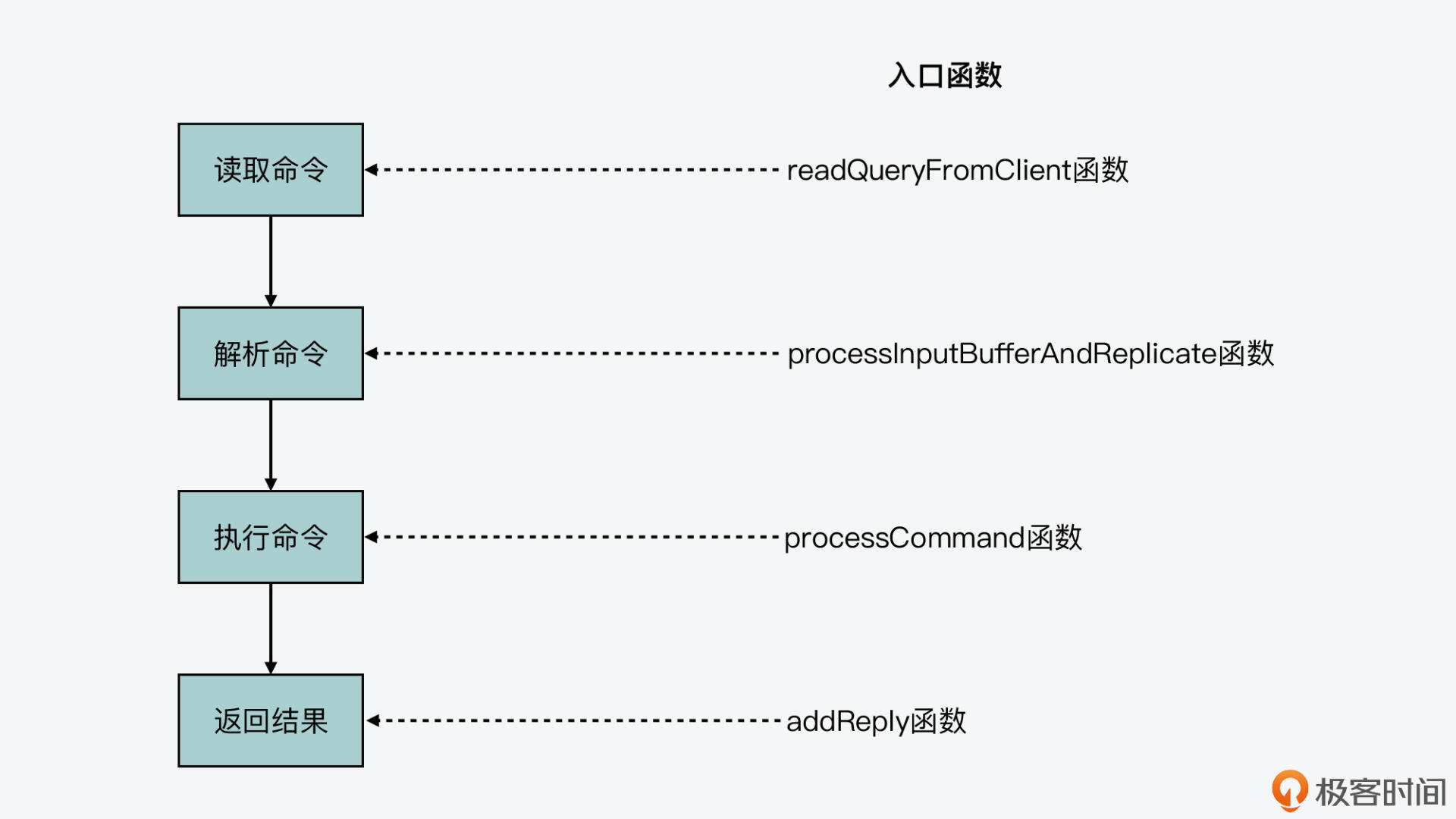 因此,集群节点在各阶段处理命令的入口函数和单个Redis server也是一样的,如下图所示。你也可以再去回顾下第14讲中,我介绍的命令处理详细流程。