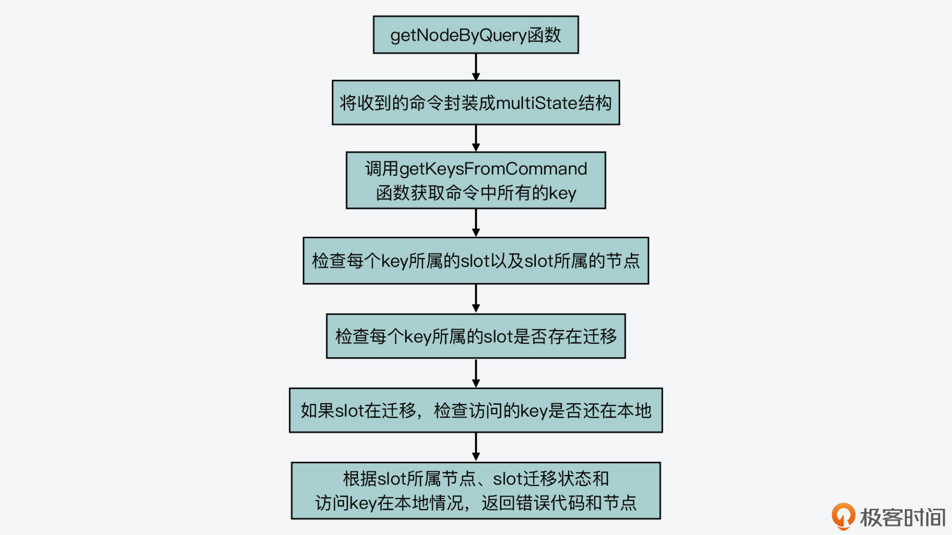 其实,刚才介绍的Redis server处理MULTI命令和缓存后续命令的流程,对于集群节点来说,也是同样适用的。也就是对于getNodeByQuery函数来说,它在查询命令访问的key时,就需要考虑MULTI命令的情况。