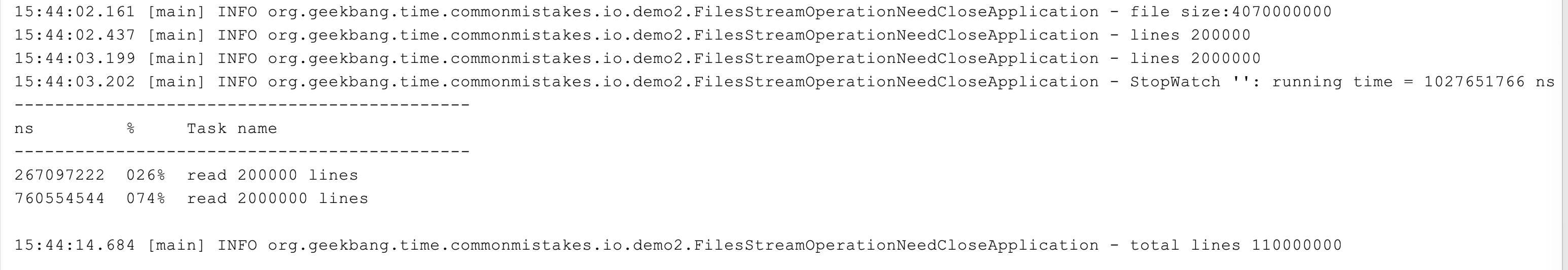 1 | 14:19:29.410 [main] INFO org.geekbang.time.commonmistakes.io.demo2.FilesStreamOperationNeedCloseApplication - total : 10000000 |