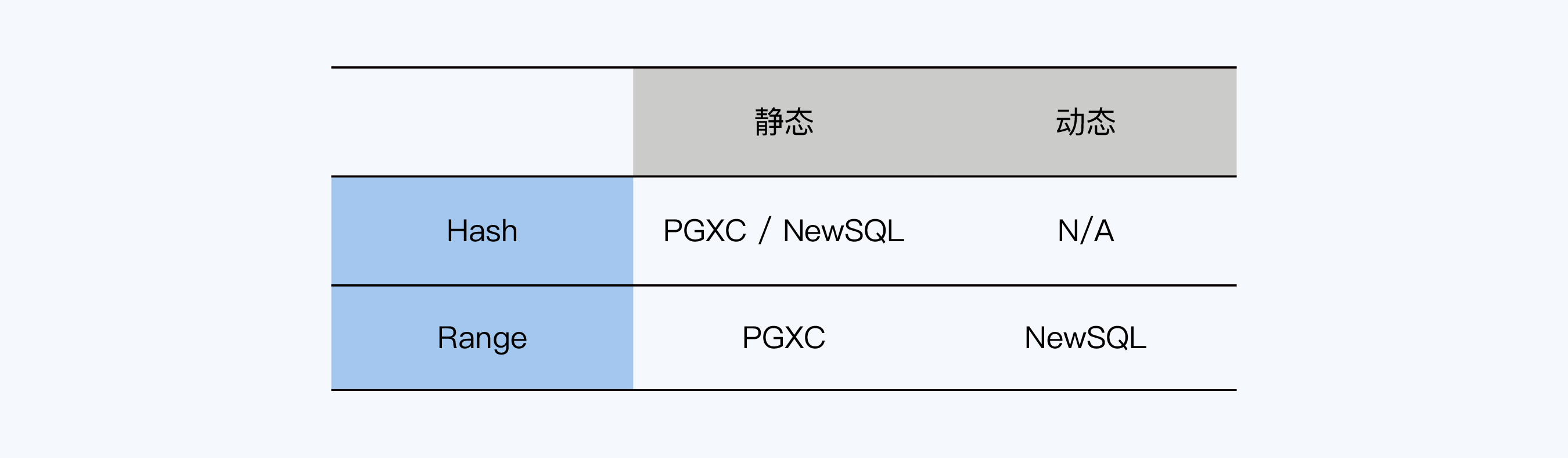 从表格中可以看出,PGXC只支持静态的Hash分片和Range分片,实现机制较为简单,所以,我就从这里开始展开吧。