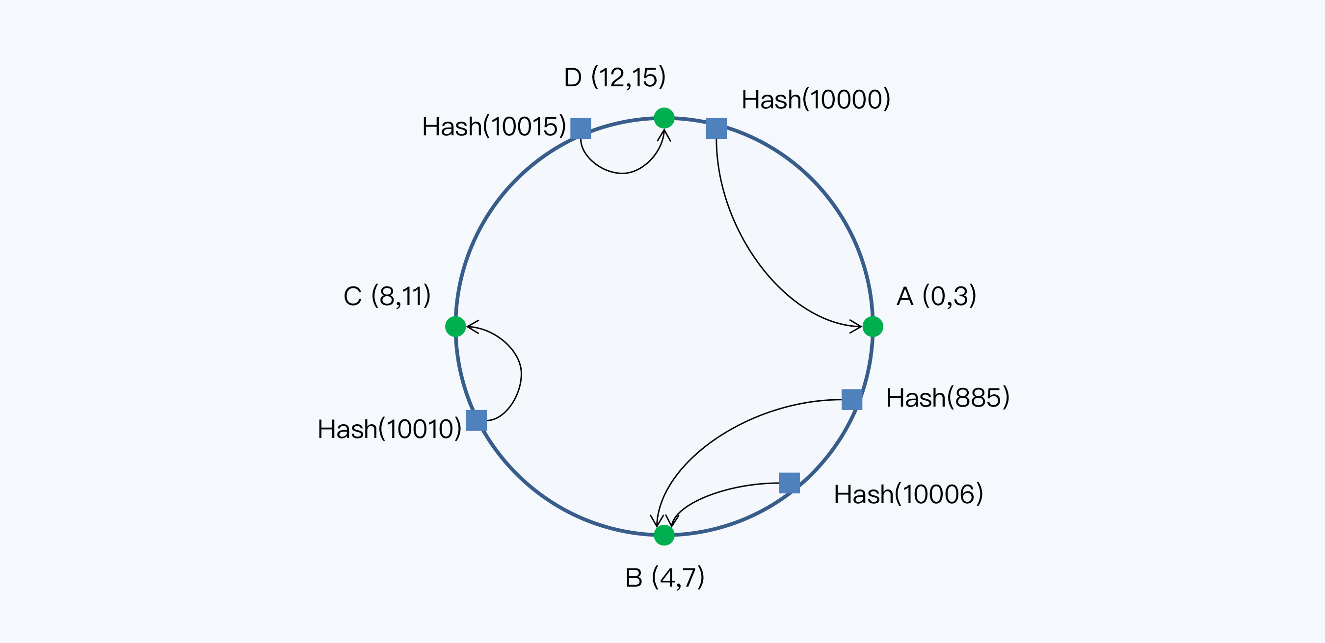 要在工业实践中应用一致性Hash算法,首先会引入虚拟节点,每个虚拟节点就是一个分片。为了便于说明,我们在这个案例中将分片数量设定为16。但实际上,因为分片数量决定了集群的最大规模,所以它通常会远大于初始集群节点数。