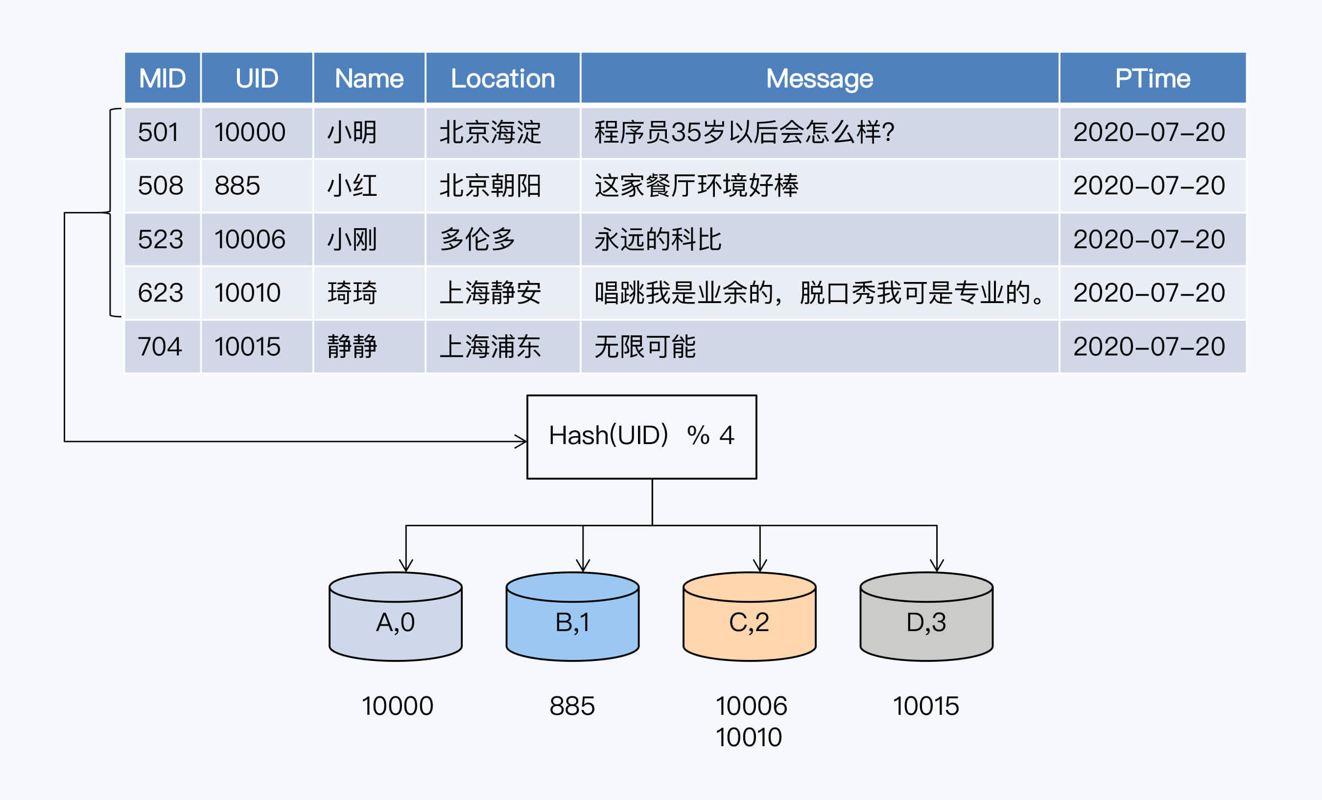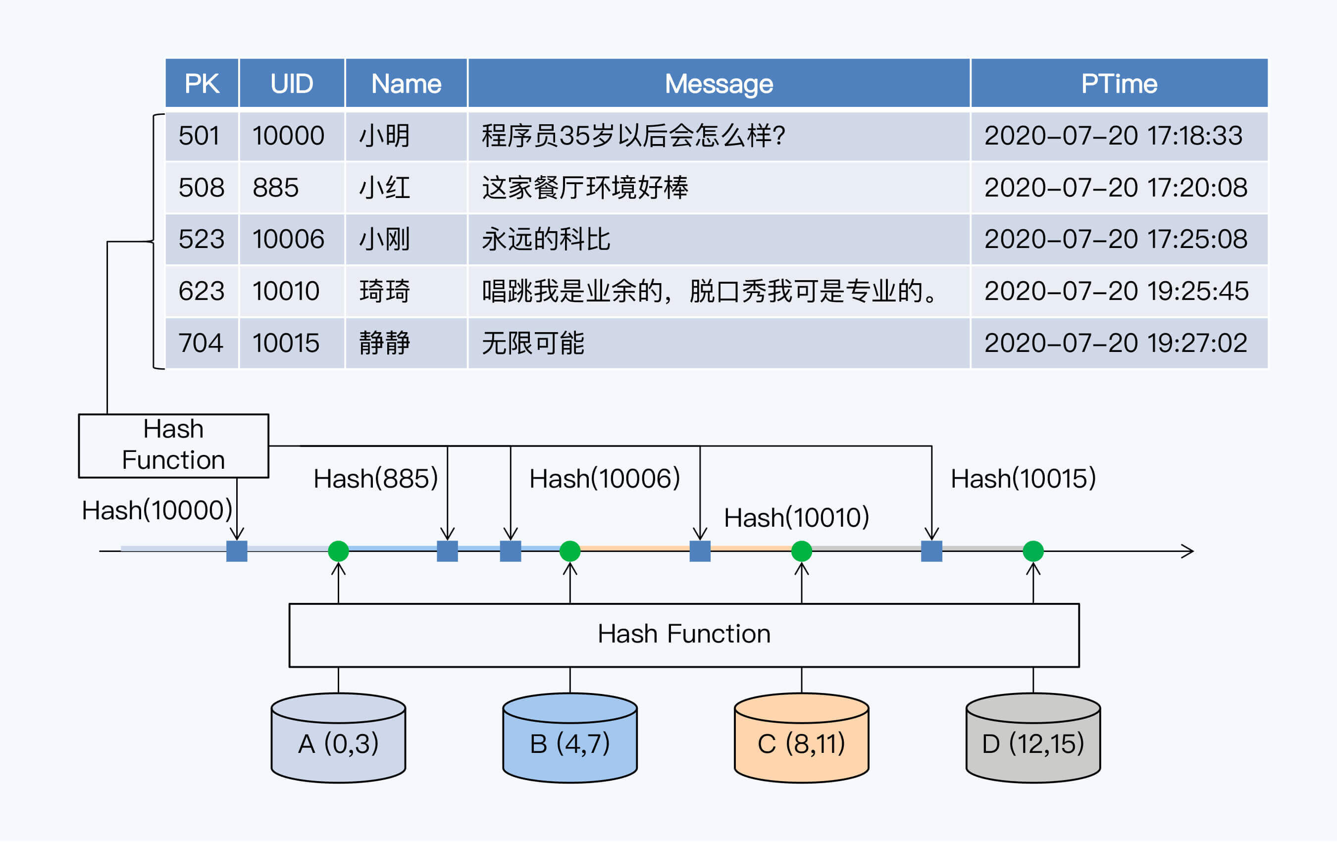图中的表格部分显示了一个社交网站的记录表,包括主键、用户ID、分享内容和分享时间等字段。假设以用户ID作为关键字进行分片,系统会通过一个Hash函数计算用户ID的Hash值而后取模,分配到对应的分片。模为4的原因是系统一共有四个节点,每个节点作为一个分片。