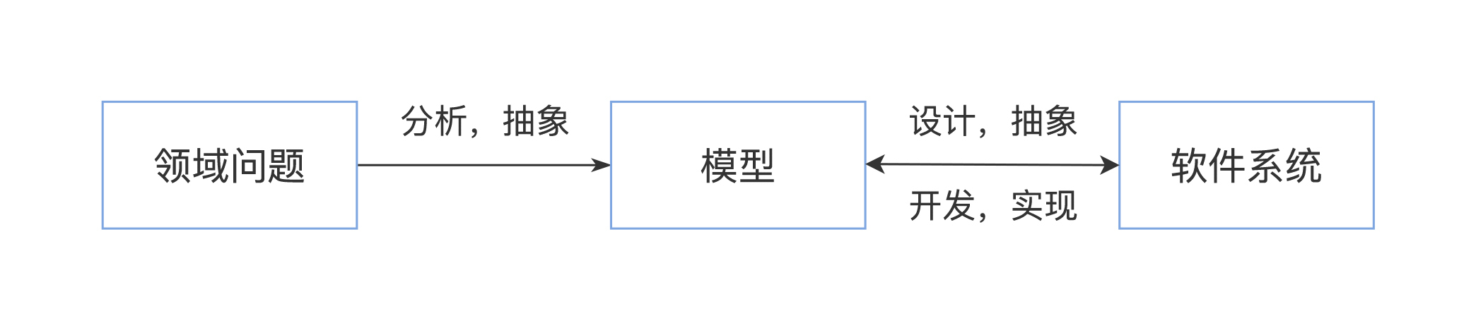 所有这两个方面客观存在的抽象,就是我们的软件模型,一方面我们要对领域问题和软件系统进行分析、设计、抽象,另一方面,我们根据抽象出来的模型开发,实现出最终的软件系统。这就是软件开发的主要过程。而对领域问题和软件系统进行分析、设计和抽象的这个过程,我们专门划分出来,就是软件建模与设计。