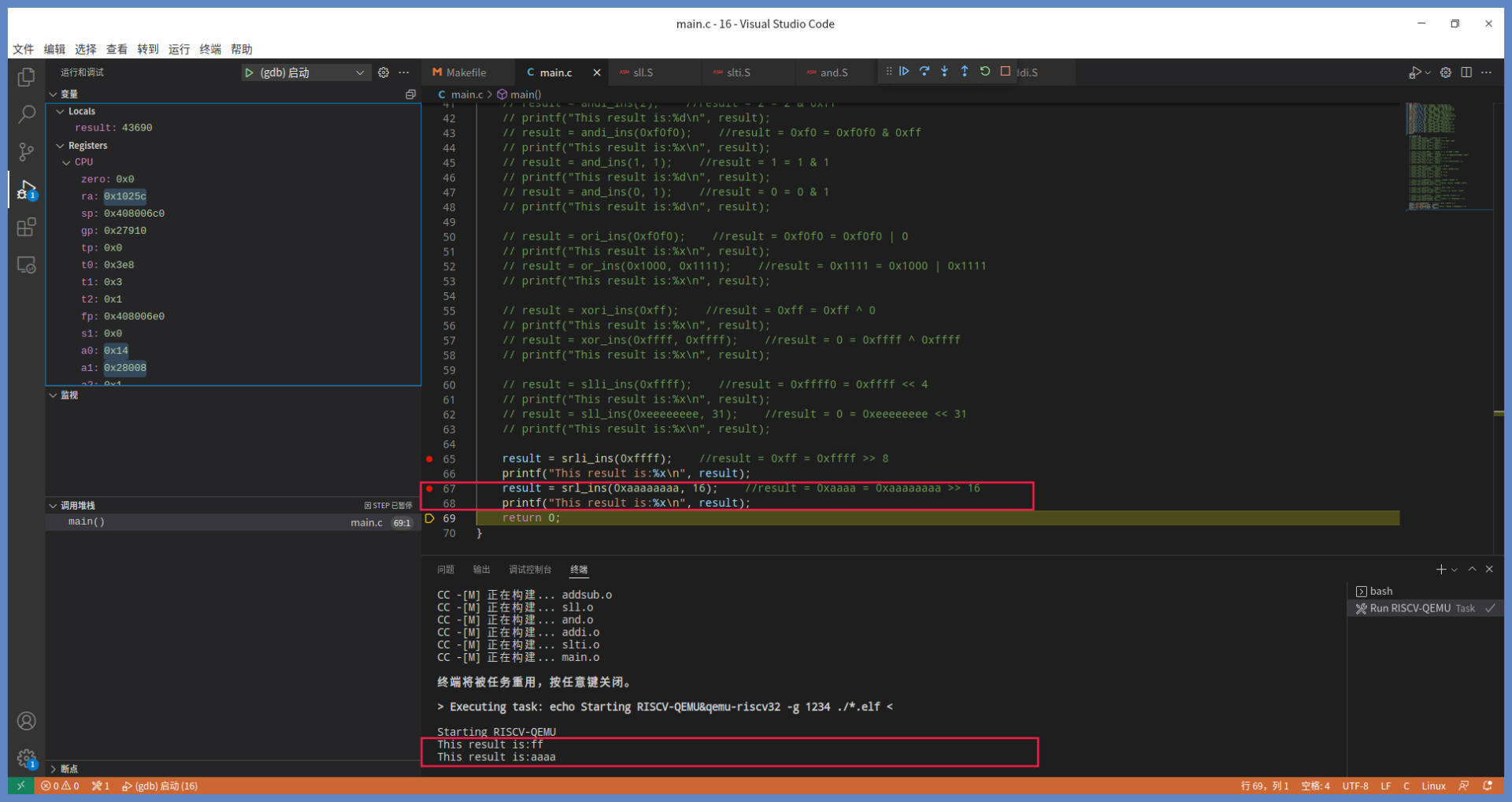 上图中是进入srli_ins函数,执行完srli a0,a0,8指令之后,执行jr ra指令之前的状态,我们给srli_ins函数传进来的参数是0xffff。现在,对照截图可以看到a0寄存器中的值确实已经变成0xff了,这说明运算结果正确。