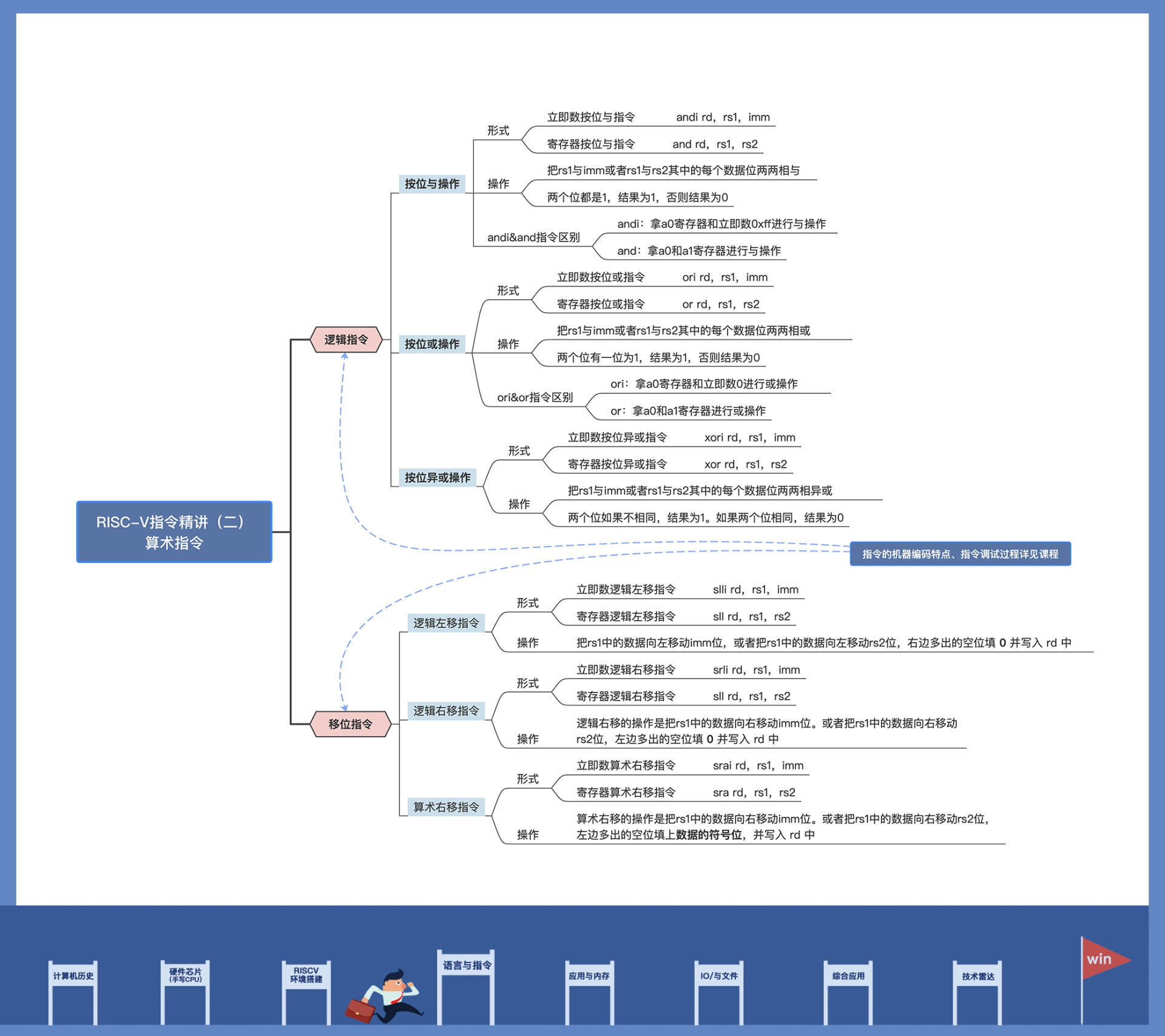 RISC-V指令集中包含了三种逻辑指令,这些指令又分为立即数版本和寄存器版本,分别是andi、and、ori、or、xori、xor这六条指令。我们学习这些指令的方法和上节课类似,也涉及到写代码验证调试的部分。