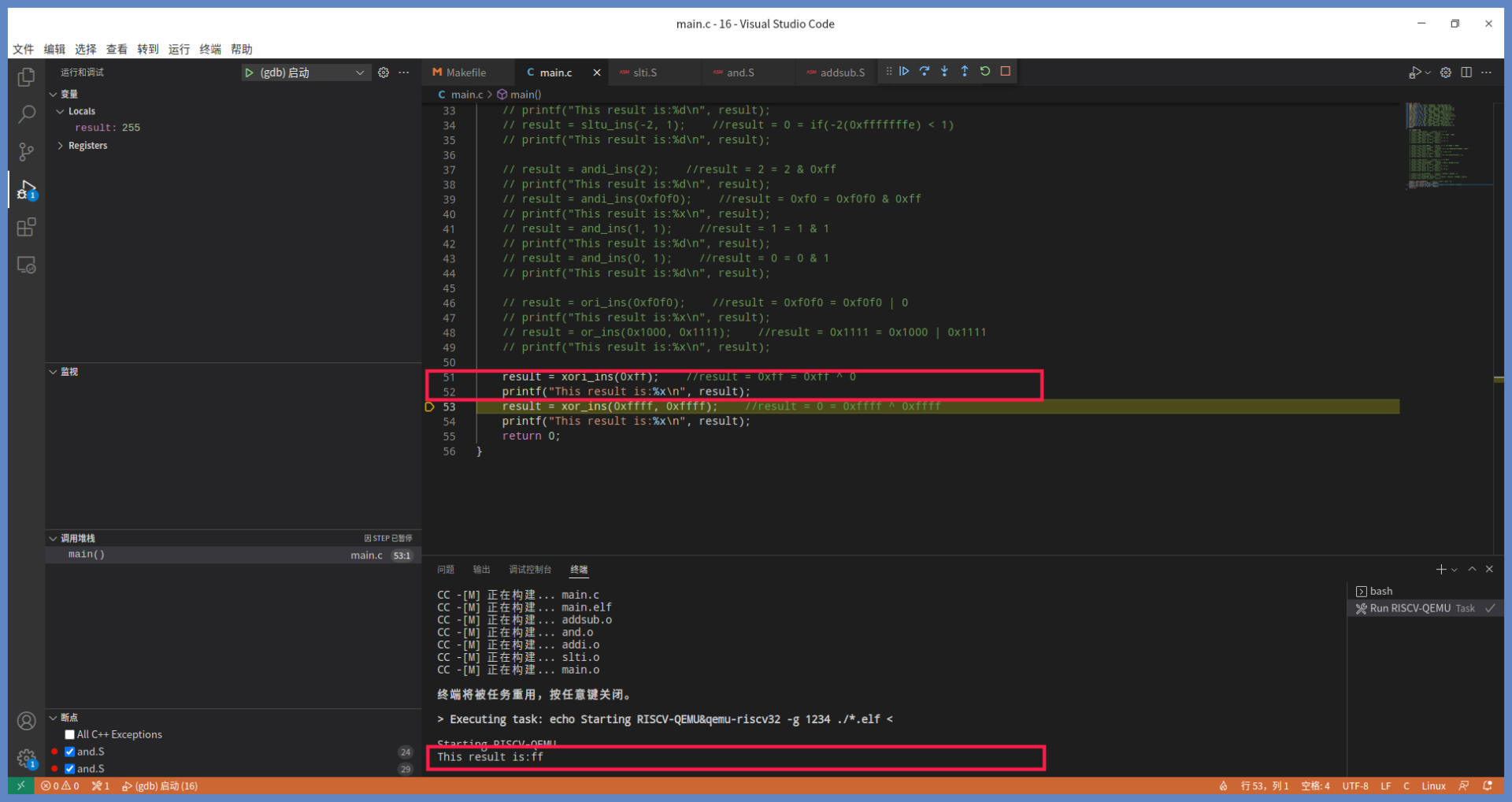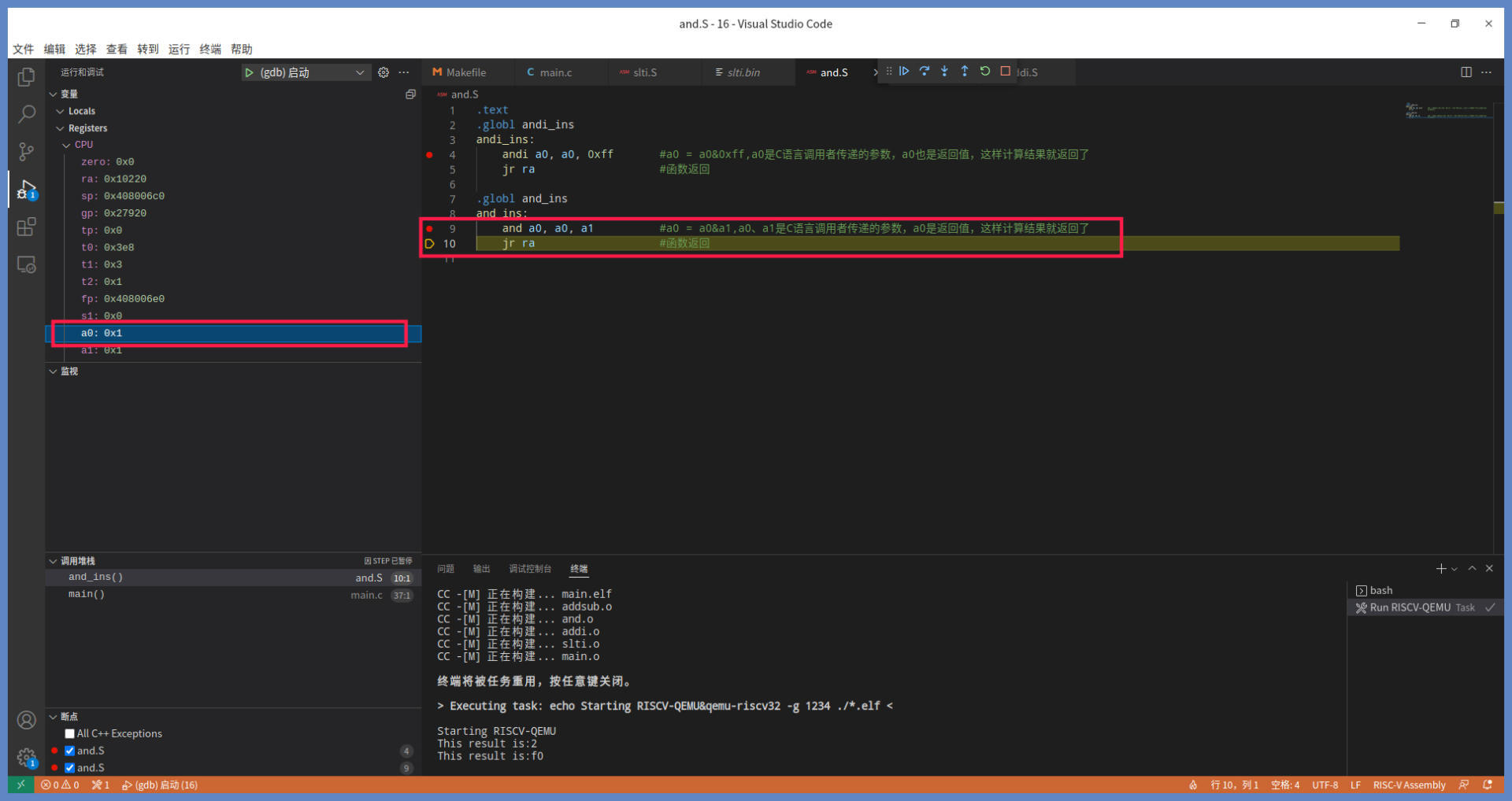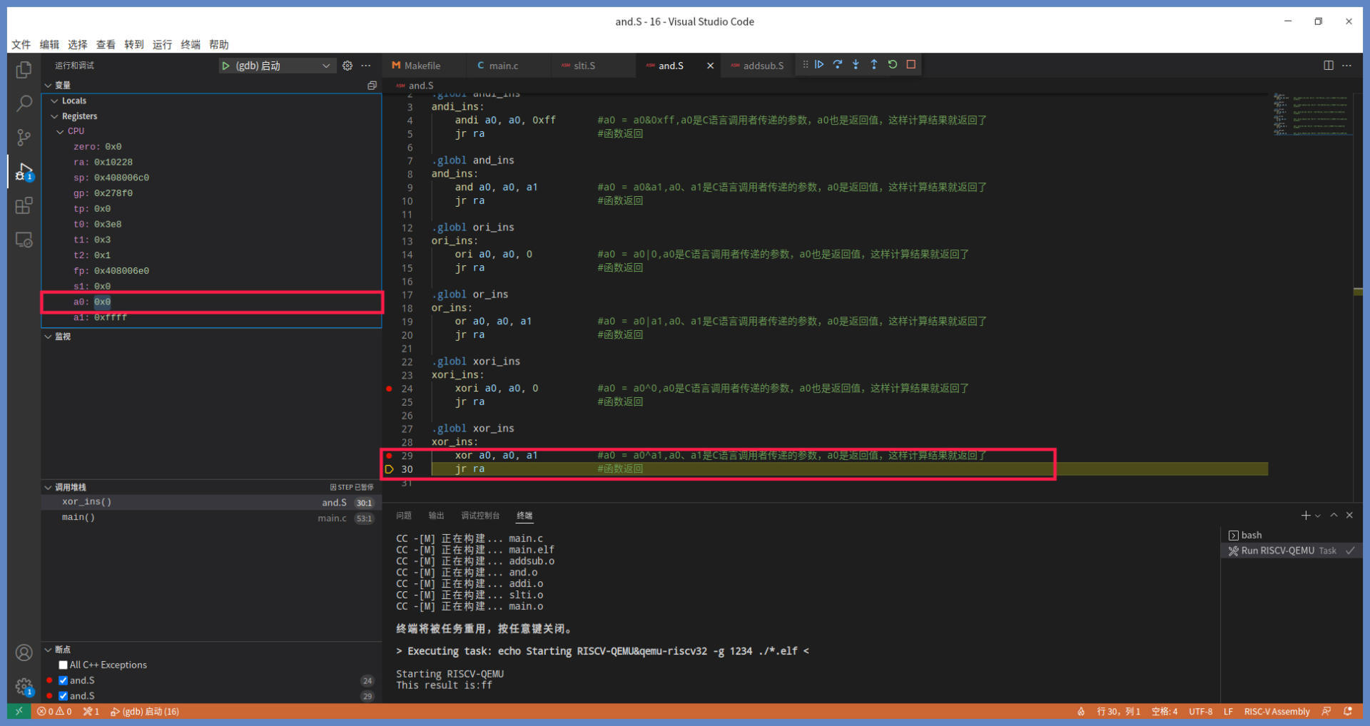 我们看到a0寄存器中的值已经变成0了,这说明运算的结果正确,符合预期。