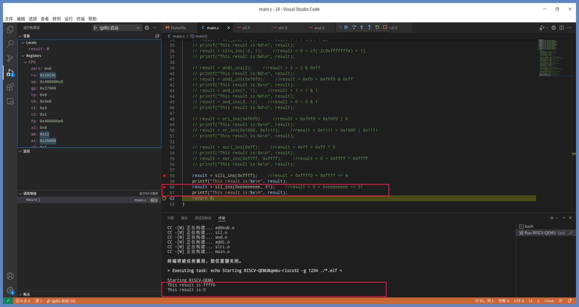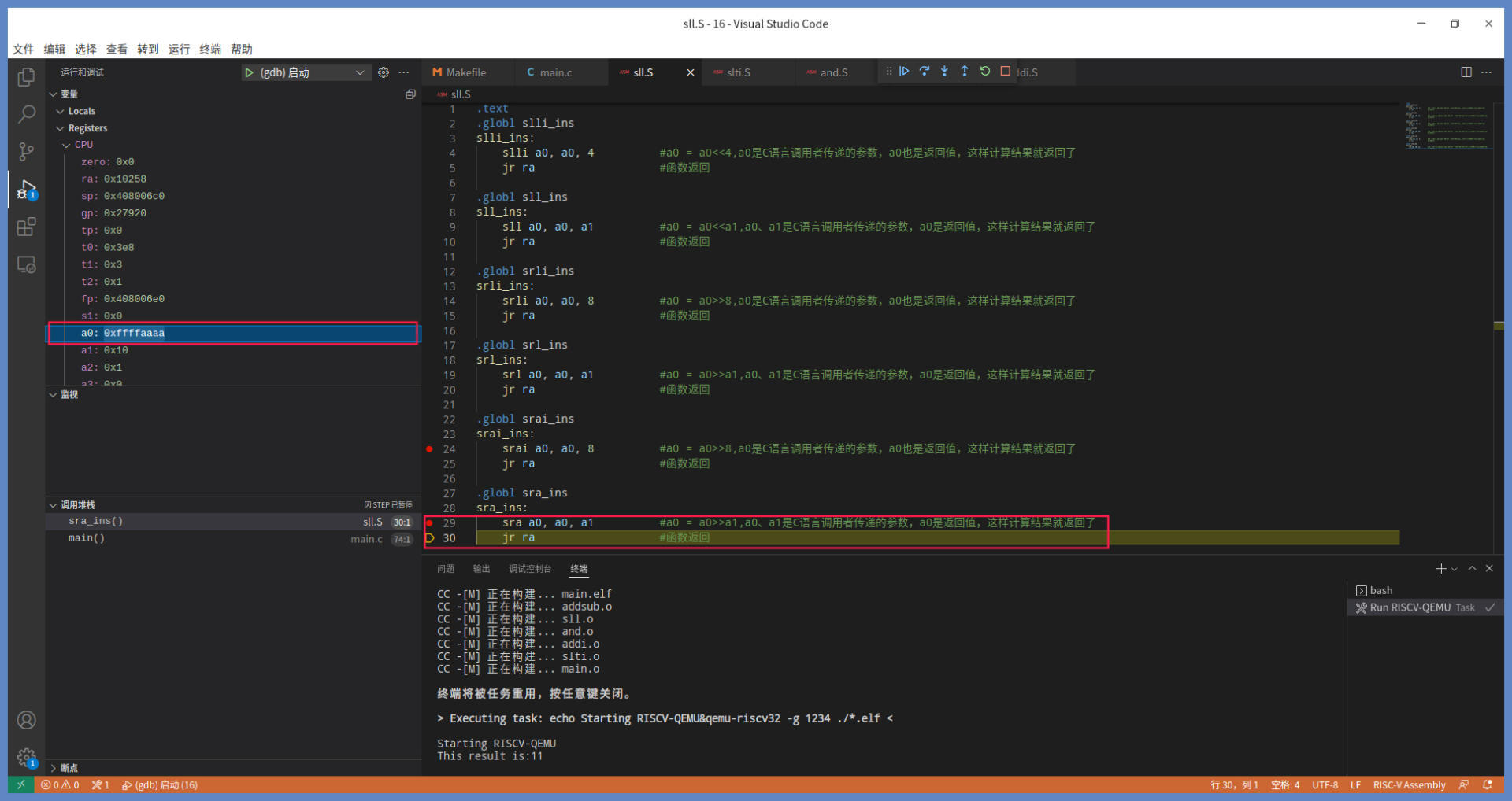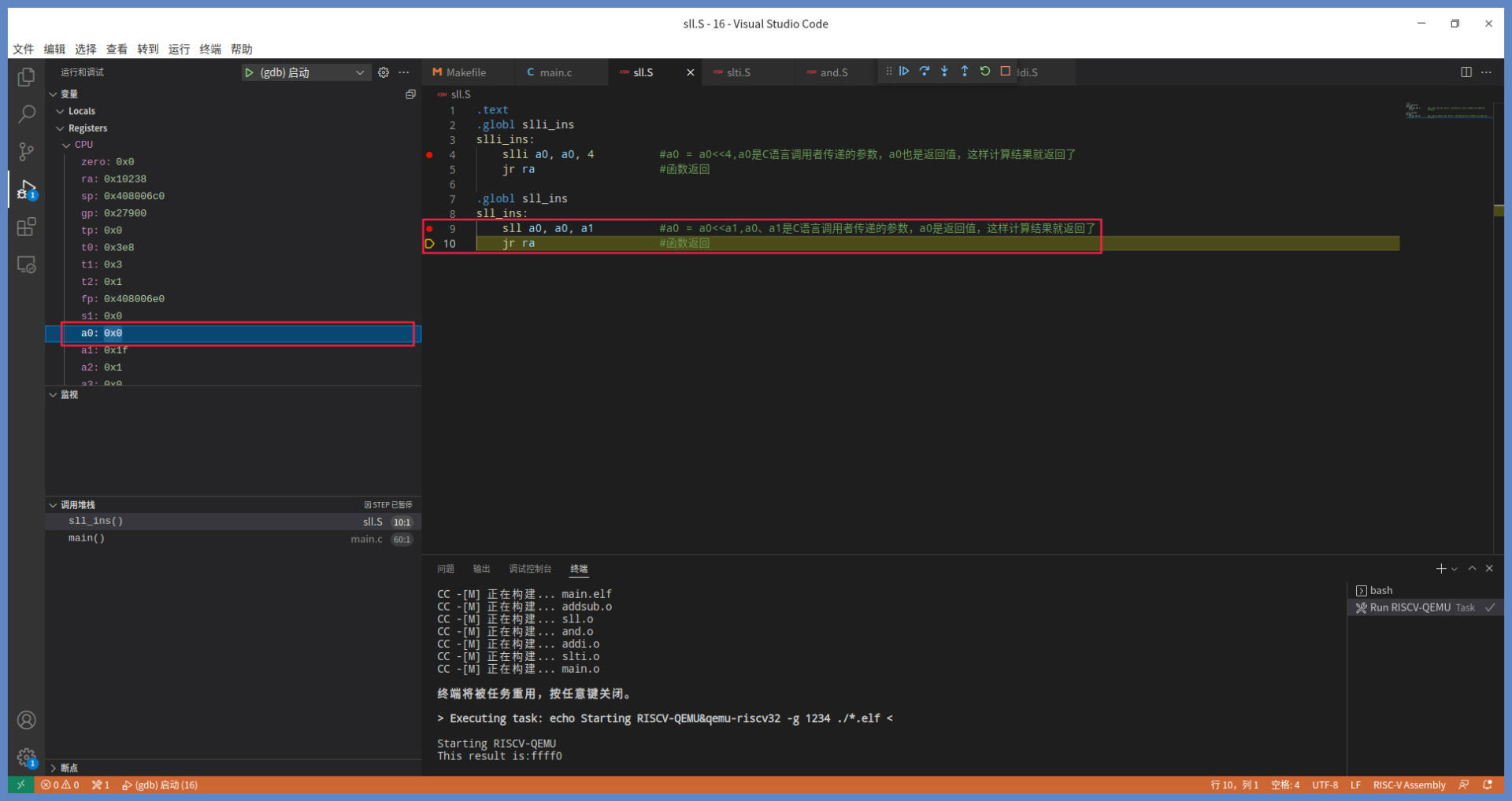 这里已经写好了slli_ins与sll_ins函数,它们会分别执行slli和sll指令。立即数逻辑左移slli指令是把a0中的数据左移4位。而逻辑左移sll指令是把a0中的数据左移,左移多少位要取决于a1中的数据,完成移动后再把结果写入到a0寄存器。