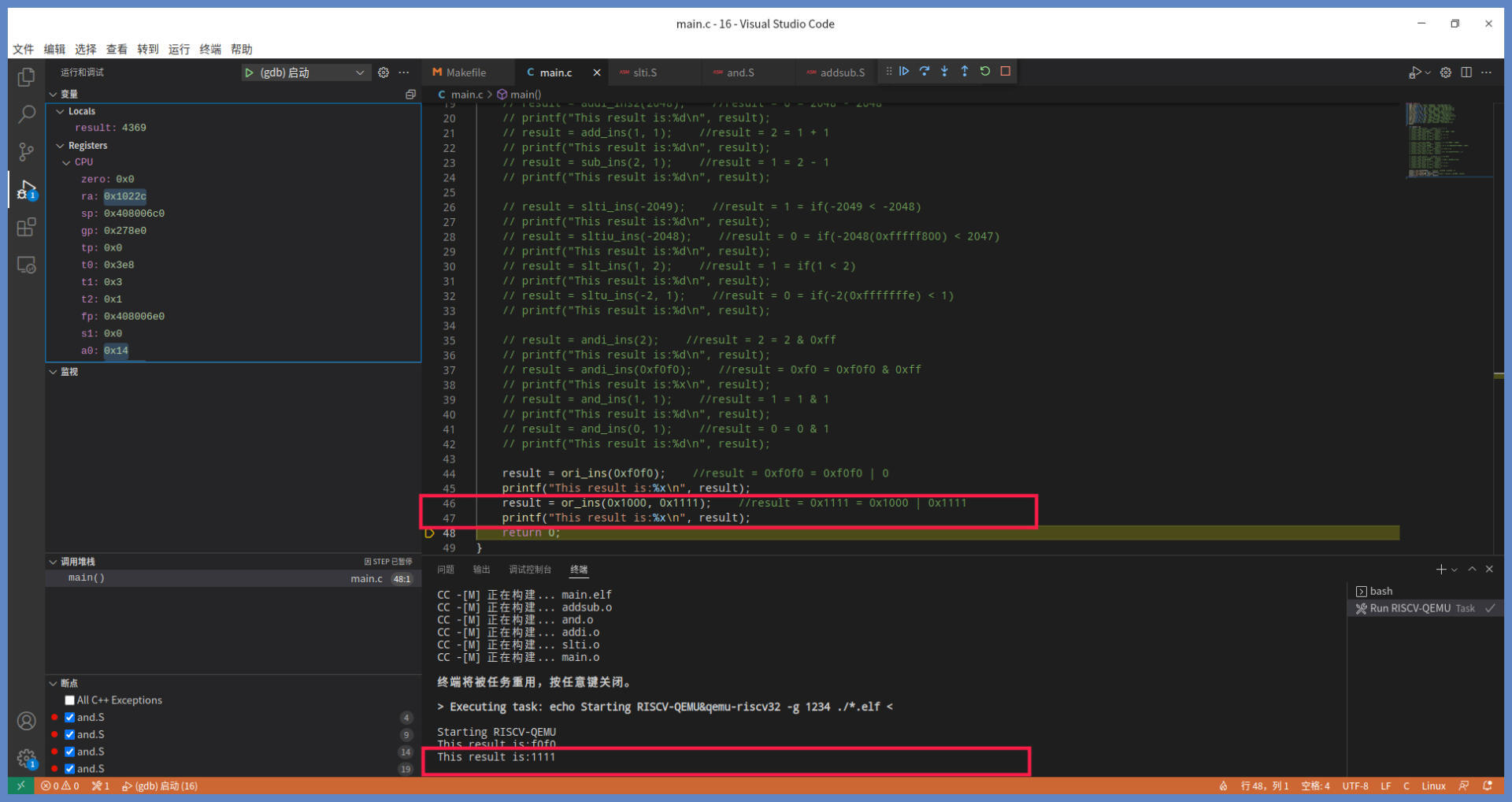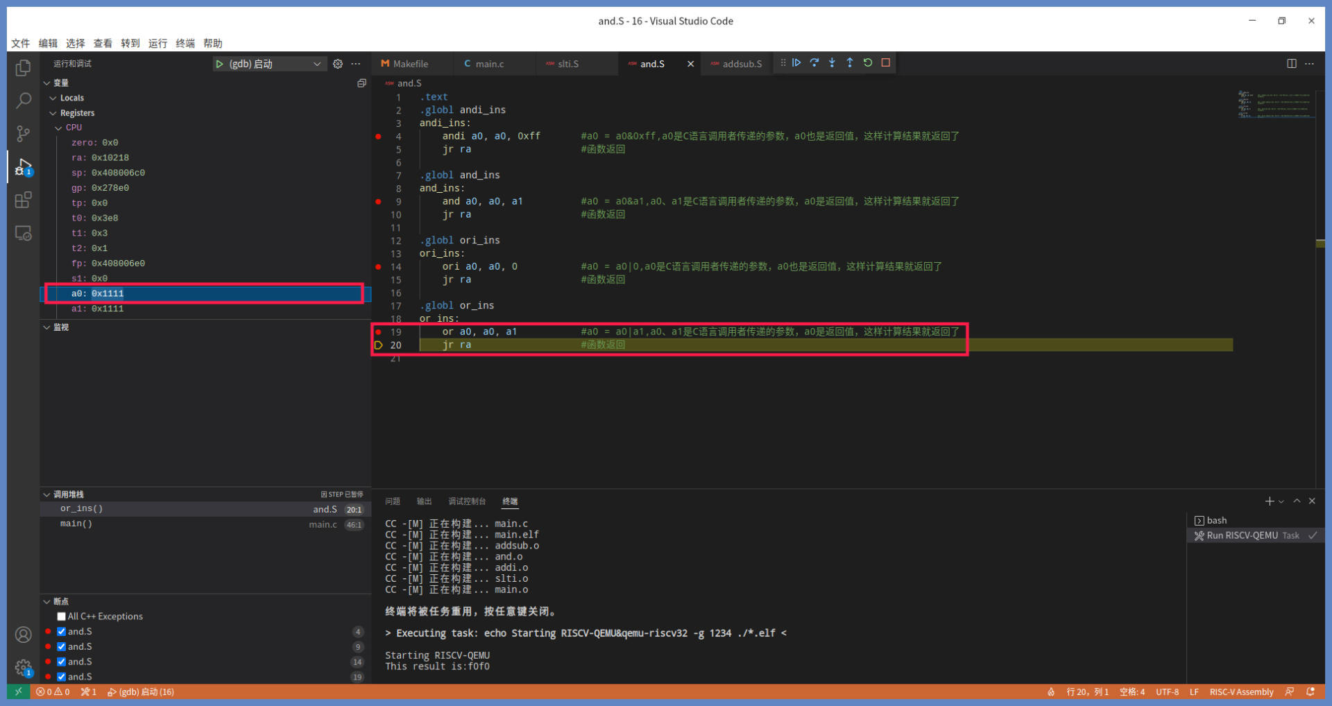 上图展示的是执行完or a0,a0,a1指令之后,执行jr ra指令之前的状态。如果我们看到a0寄存器中的值确实已经变成0x1111了,就说明运算的结果正确,符合预期。