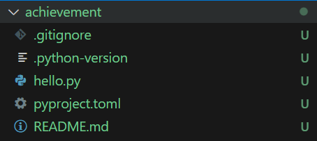 表示初始化成功,同时会自动创建出一个如下图所示的 achievement 文件夹,里面主要包含了一个测试文件hello.py,项目包管理文件 pyproject.toml 以及 README.md。在本小节,不涉及到 pyproject.toml 内容的修改,所以在 achievement 文件夹下只能有一个 .py文件,需要将hello.py删掉。