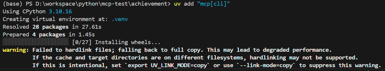 之后进入到 achievement 文件夹,执行如下命令安装 mcp 包。