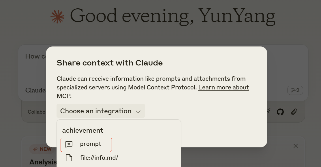 这个功能,也必须用 Claude Desktop 才能测试。我们重启 Claude Desktop,让其重新加载 MCP Server。之后,依然是点击插头按钮,会看到比之前多了一个 prompt。