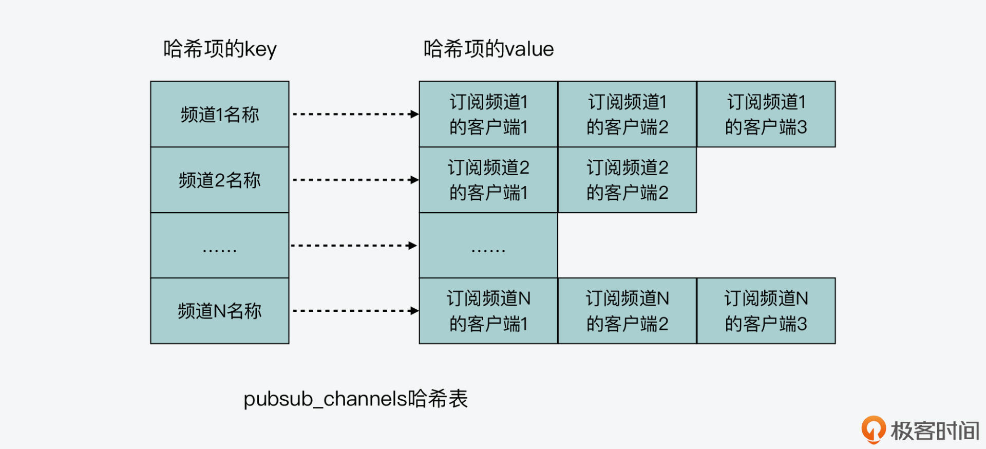 注意,当哈希表是keylistDictType类型时,它保存的哈希项的value就是一个列表。而之所以采用这种类型来保存频道信息,是因为Redis把频道的名称作为哈希项的key,而把订阅频道的订阅者作为哈希项的value。就像刚才我们介绍的,一个频道可以有多个订阅者,所以Redis在实现时,就会用列表把订阅同一个频道的订阅者保存起来。