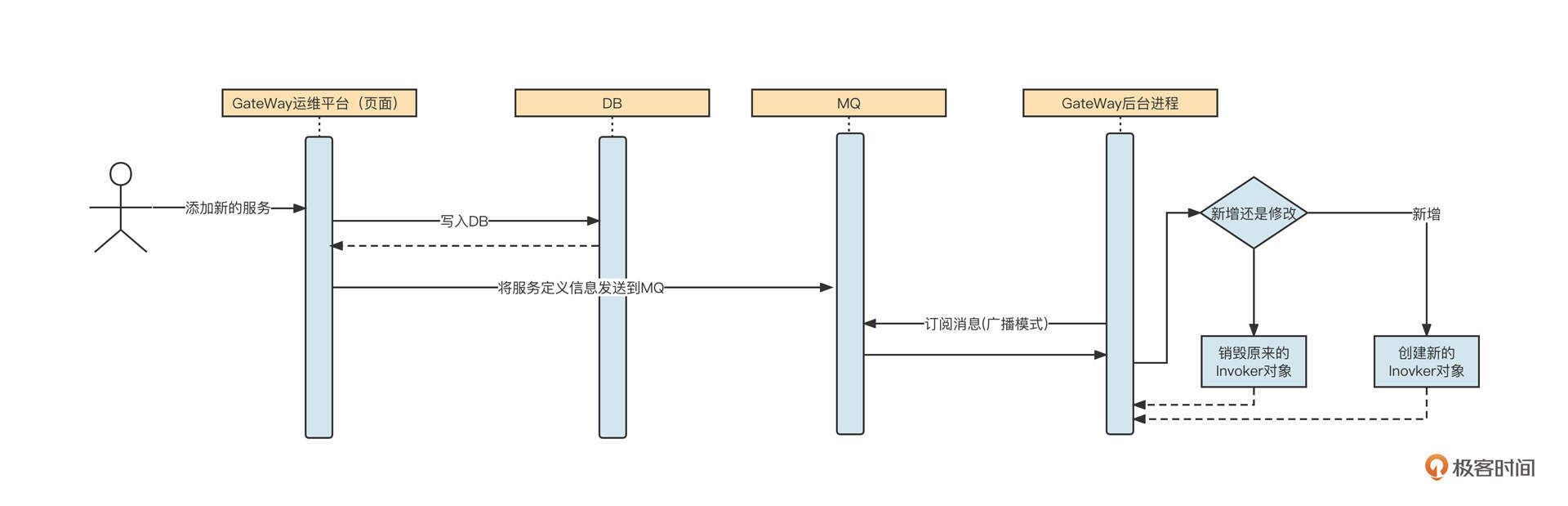 也就是说,用户如果在网关运营平台上修改原有服务协议(Dubbo服务)或者添加新的服务协议,变动后的协议会首先存储到数据库中,然后运营平台发送一条消息到MQ,紧接着Gateway的后台进程以广播模式进行订阅。这样,所有后台网关进程都可以感知。