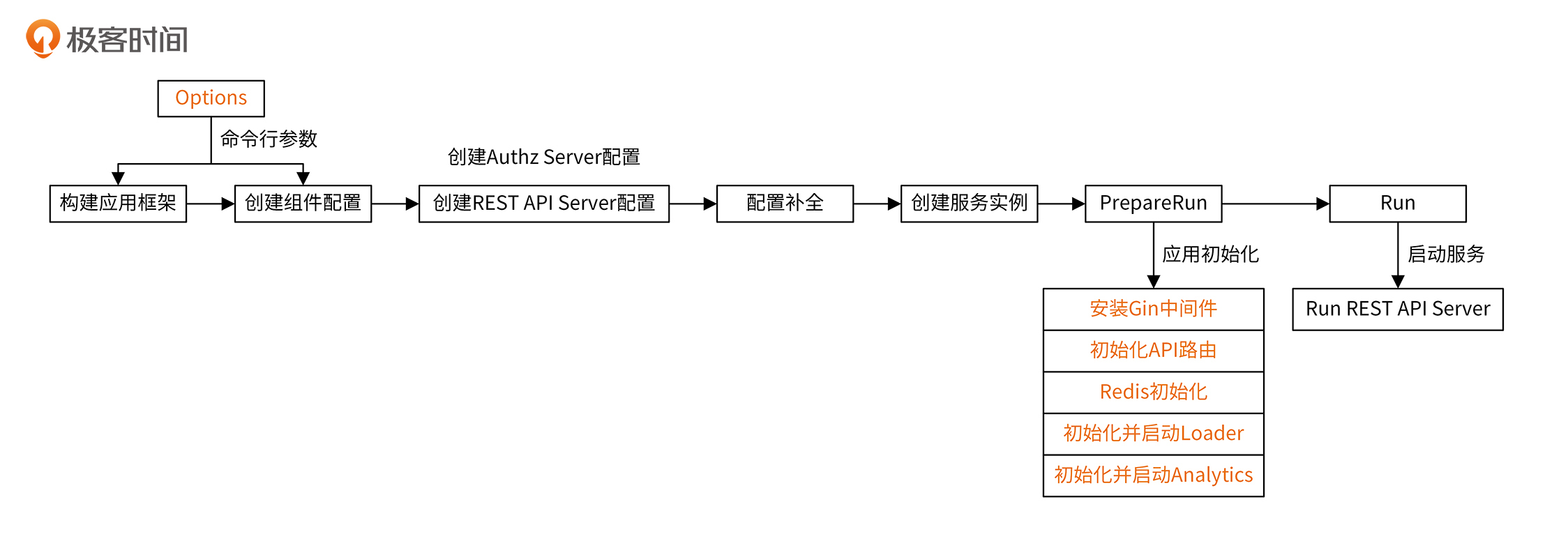 iam-authz-server的启动流程也和iam-apiserver基本保持一致。二者比较大的不同在于Options参数配置和应用初始化内容。另外,和iam-apiserver相比,iam-authz-server只提供了REST API服务。启动流程如下图所示: