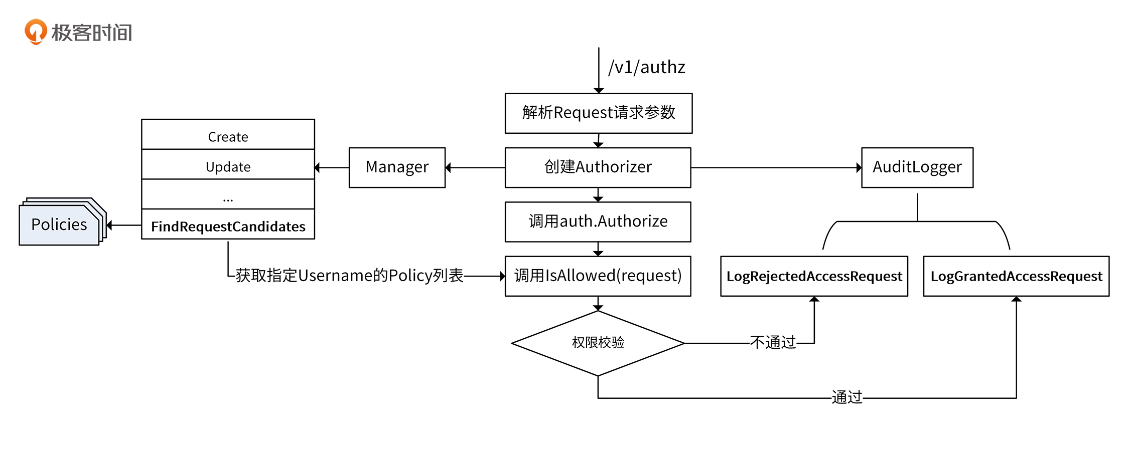 Manager包含一些函数,比如 Create、Update和FindRequestCandidates等,用来对授权策略进行增删改查。AuditLogger包含 LogRejectedAccessRequest 和 LogGrantedAccessRequest 函数,分别用来记录被拒绝的授权请求和被允许的授权请求,将其作为审计数据使用。