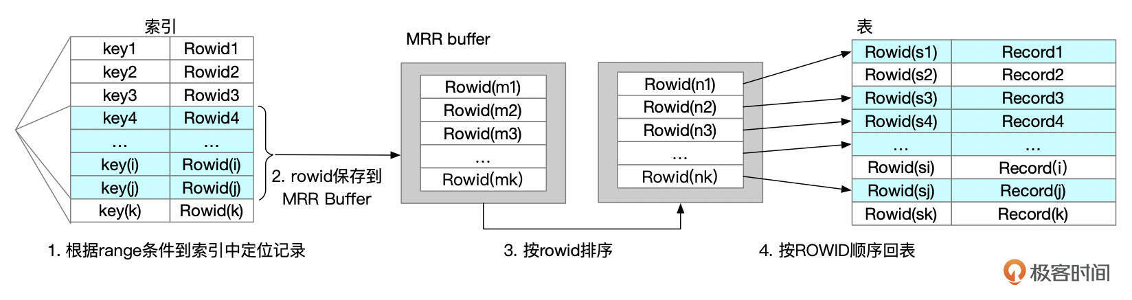 MRR访问路径会先在MRR buffer中对ROWID进行排序。MRR buffer的大小由参数read_rnd_buffer_size控制。MRR访问路径的成本计算中,加入了对ROWID进行排序的成本。按ROWID顺序回表时,IO成本的计算方式也有一些调整。不过这里我们就不展开讨论MRR成本的计算细节了。