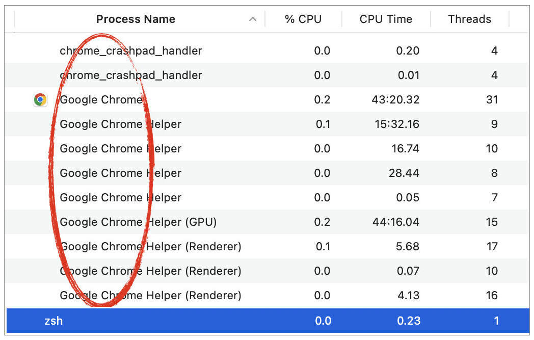 为了更好地理解上面的定义,咱们可以使用 Mac 系统自带的 Activity Monitor 工具,去查看相关应用到底有哪些进程。比如,下图是我在电脑中开的 Chrome 应用和 zsh 命令行应用: