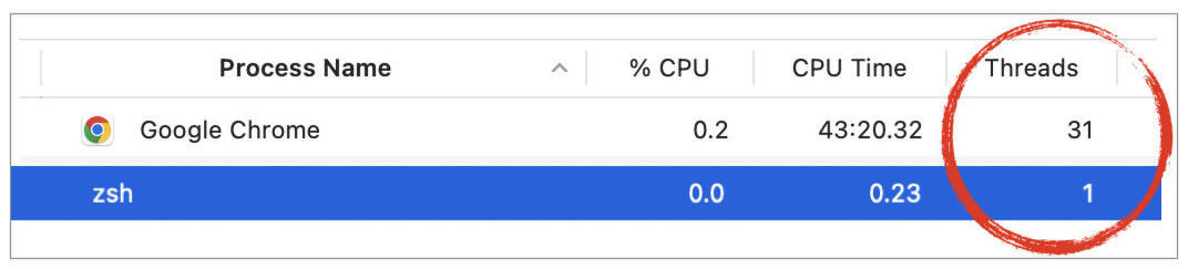 Google Chrome 的进程它有 31 个线程,而 zsh 进程只有 1 个线程。