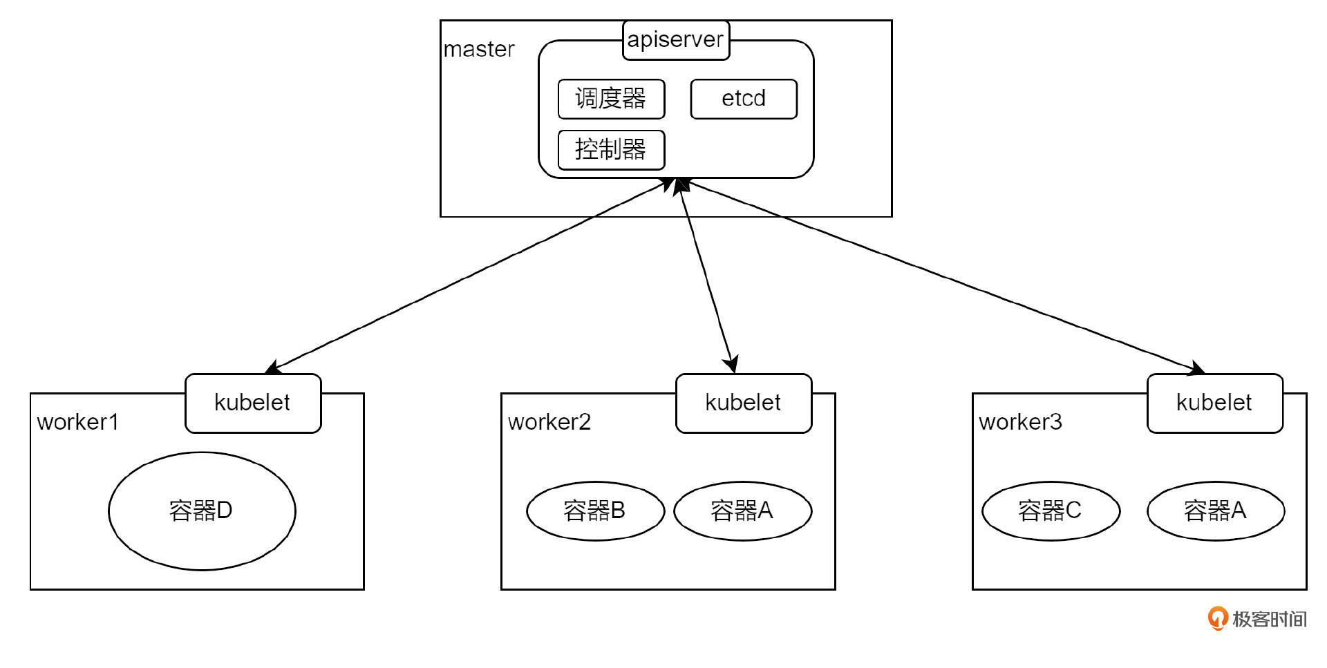 那这些服务器之间是如何关联的呢?这会有一个主程序进行统一的管理。通常主程序是单独部署到一台服务器上的,也就是所谓的 master 节点,剩余的跑容器应用的服务器叫做 worker 节点。在 worker 节点上会安装一个客户端程序,学名叫 kubelet,主程序不能直接和容器应用建立联系,而是通过与 kubelet 建立联系来实现对容器应用的编排等操作。因此图就变成了这样: