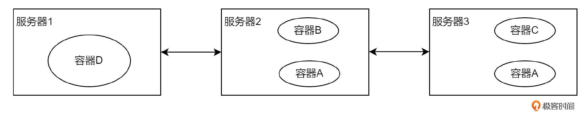 假设有一天,我想运行一个特别消耗 CPU、内存资源的容器 D。但三台服务器上都有应用占用资源,导致容器 D 无法运行。此时的解决方案就是,把容器 A 迁移到服务器 2 上去,给容器 D 腾地方。